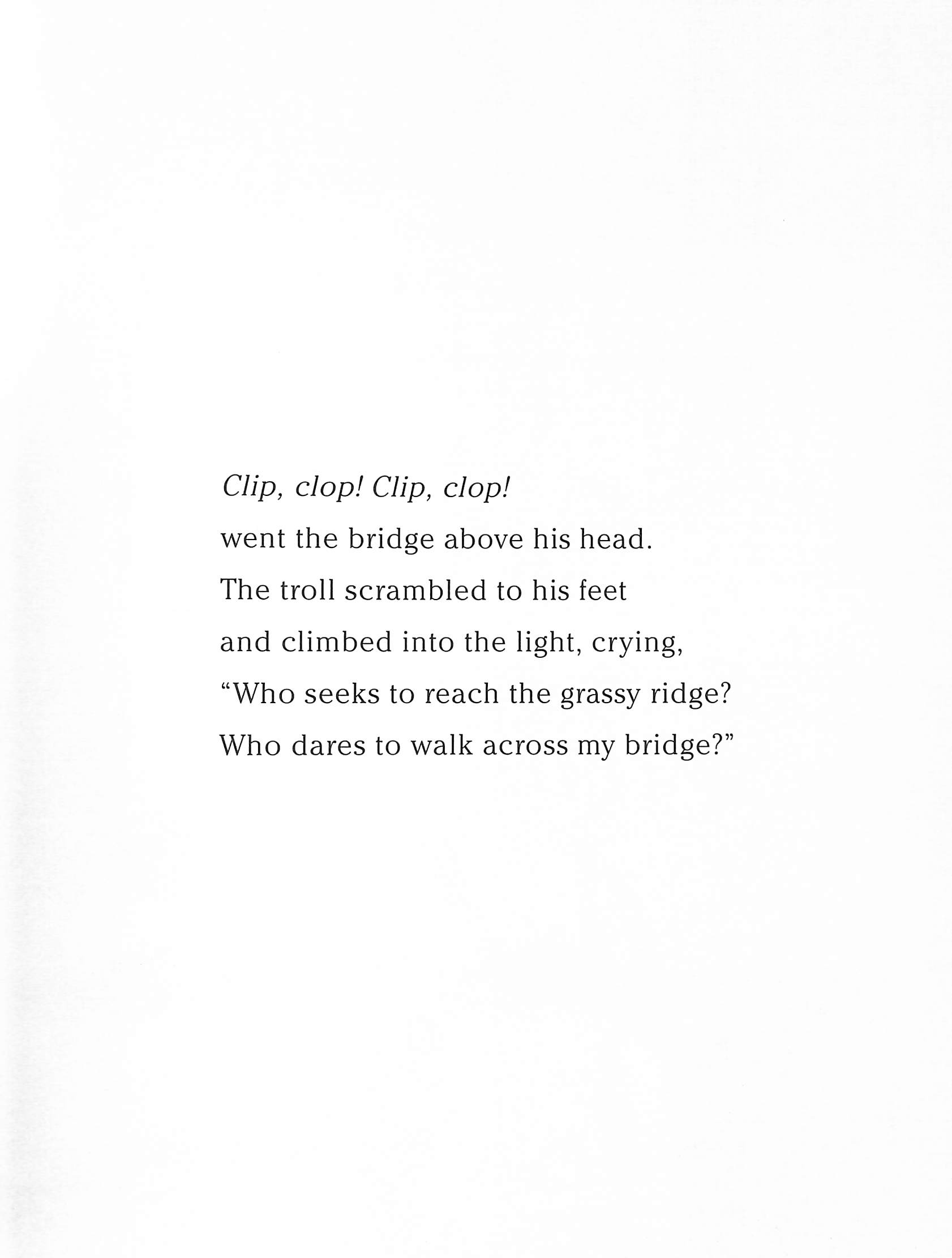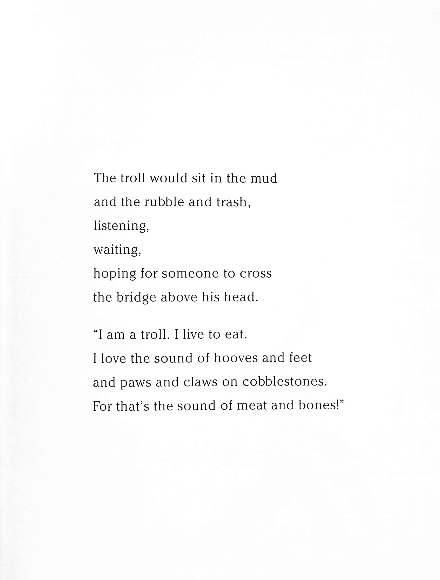 A brilliant retelling of the well-loved classic The Three Billy Goats Gruff – with a hilarious twist! I am a troll. I live to eat. I love the sound of hooves and feetand paws and claws on cobblestones. For that’s the sound of meat and bones! What lives under the bridge? A terrifying troll who is always hungry! And this troll loves to gobble up anyone who dares to cross the bridge, but his favourite of all is billy goat: goat rump in a honey glaze, curried goat and goat smeared on toast – you name it, this troll LOVES it! So, when the three Billy Goats Gruff decide to clip clop clip clop across the bridge, the troll is already imagining all the scrumptious ways to fill his belly. But what if the troll is about to underestimate those seemingly sweet goats… And bite off more than he can chew! A story told with pitch perfect timing, pacing and hilarious detail with Barnett's signature narrator voice, this is Billy Goats Gruff as never before! Award-winning illustrator, Jon Klassen, brings the story to life with his stunning visuals The first in an incredible new collection of fractured fairy tales crafted by one of today's most celebrated and acclaimed author-illustrator duos