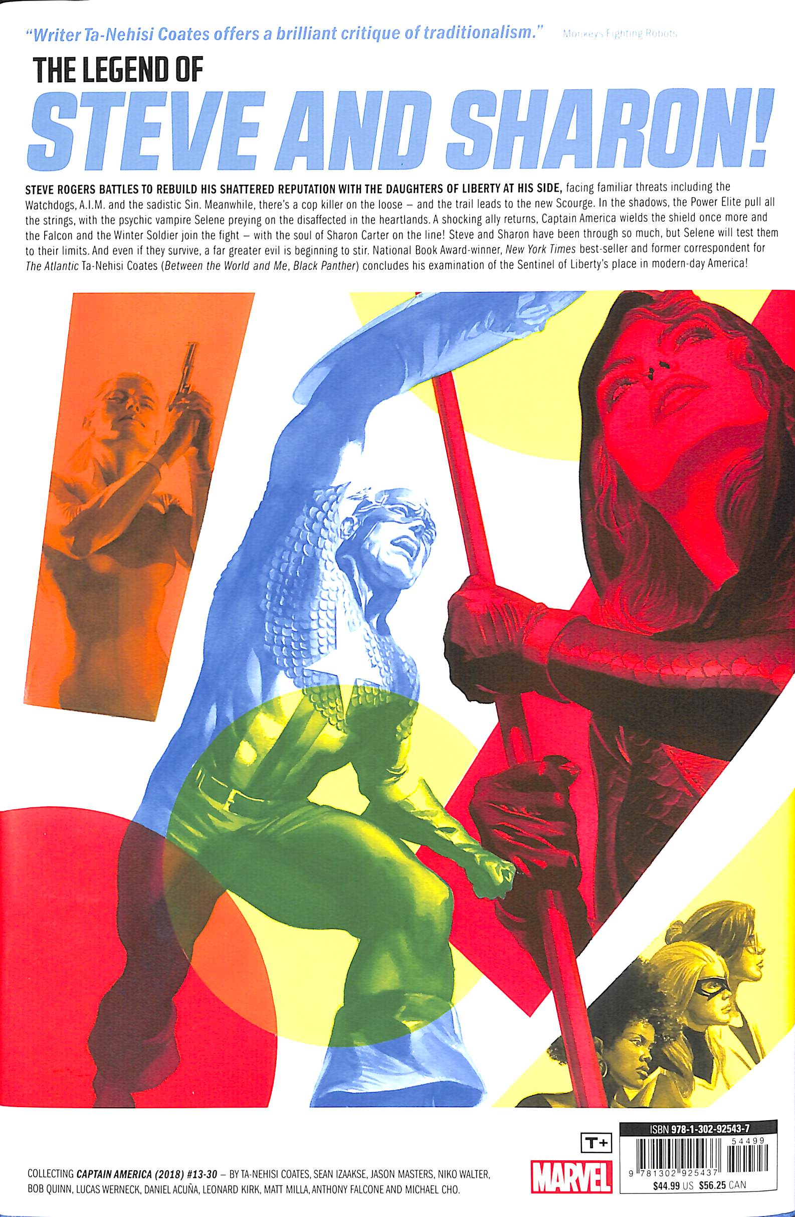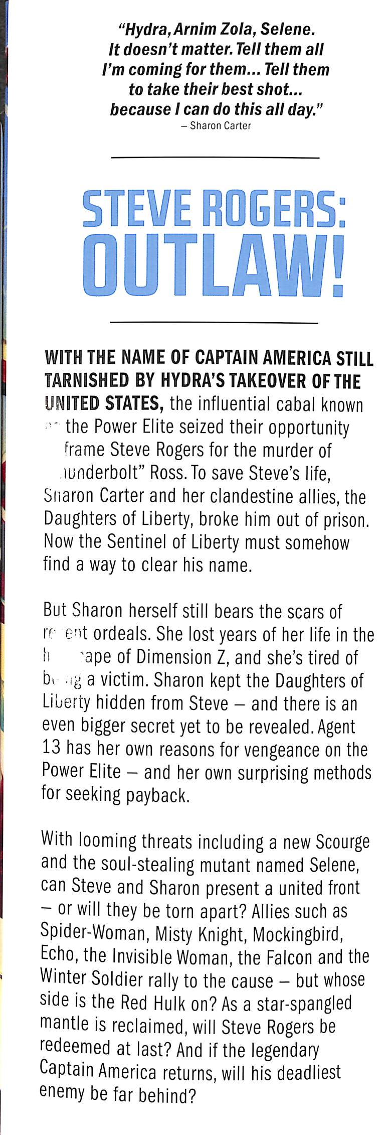 Ta-Nehisi Coates continues to put the Sentinel of Liberty through the wringer! Framed for a crime he did not commit and pursued by a dogged Nick Fury, Steve Rogers takes on the Power Elite and their insidious minions with help from the Daughters of Liberty! Disgraced and hunted, Steve has been forced underground but he's not down and out yet. And the hour is drawing nigh when he will once again pick up the shield and don the stars and stripes! But which of Steve's closest allies will do the same with the armor of the Iron Patriot? And who will be the new Agent 13? But even as Captain America returns, so too does his greatest enemy and now, Steve Rogers must marshal his forces to face the reborn Red Skull!