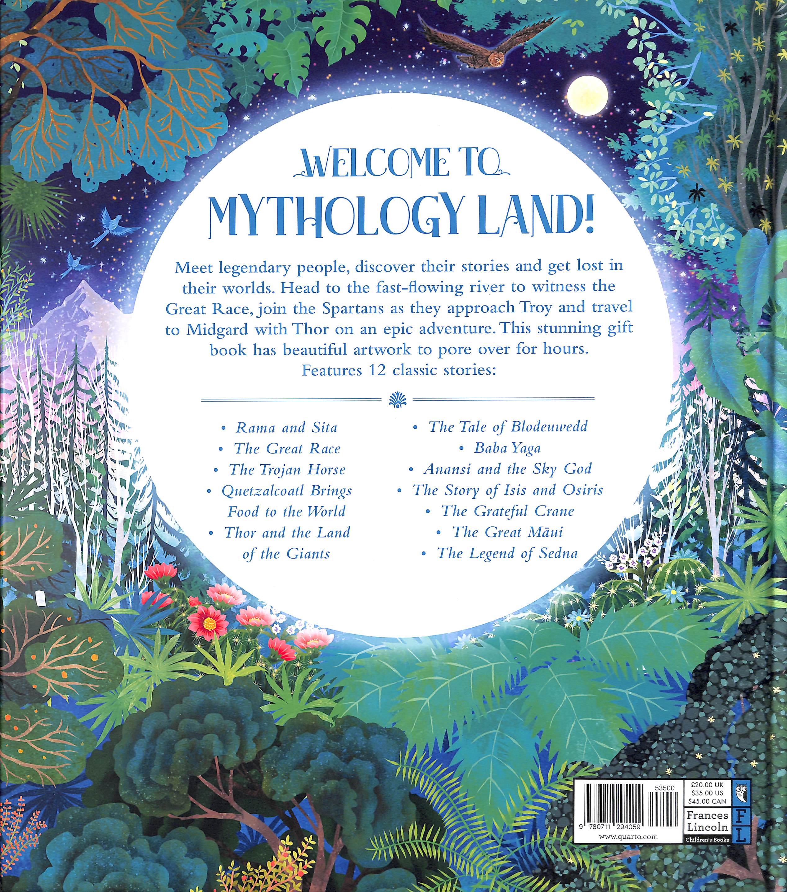 Travel to Midgard and face the giants with Thor, race along the Yangtze River to see which animal wins the great race, or delight in the thrilling run from Baba Yaga in the Deep Dark Forest.  What wonders will you discover along the way? Mythology Land includes 12 legendary tales from around the world: Rama & Sita (Hindu) The Great Race (Chinese) The Trojan Horse (Greek) Quetzalcoatl Brings Food to the World (Aztec) The Great Maui (Polynesian) Thor and the Land of the Giants (Norse) The Tale of Blodeuwedd (Welsh) Baba Yaga (Slavic) Anansi and the Sky God (Ghanaian) The Story of Isis and Osiris (Egyptian) The Grateful Crane (Japanese) The Legend of Sedna (Inuit)  With vibrant, intricately detailed illustrations, Mythology Land transports readers to faraway lands of mystery, fantasy and magic, making this magical anthology something to be treasured and revisited time and time again.
