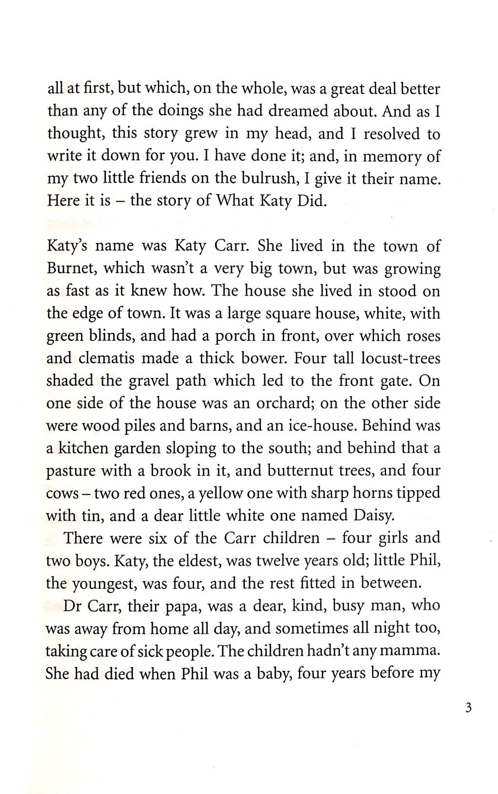 Rediscover the Puffin Classics collection and bring the best-loved classics to a new generation - including this new resized edition of What Katy Did, complete with a bold new cover. 'I will do it tomorrow. How often we all do so and what a pity it is that when morning comes and tomorrow is today we so frequently wake up feeling quite differently. . . 'Katy Carr intends to be beautiful and beloved and as sweet as an angel one day.