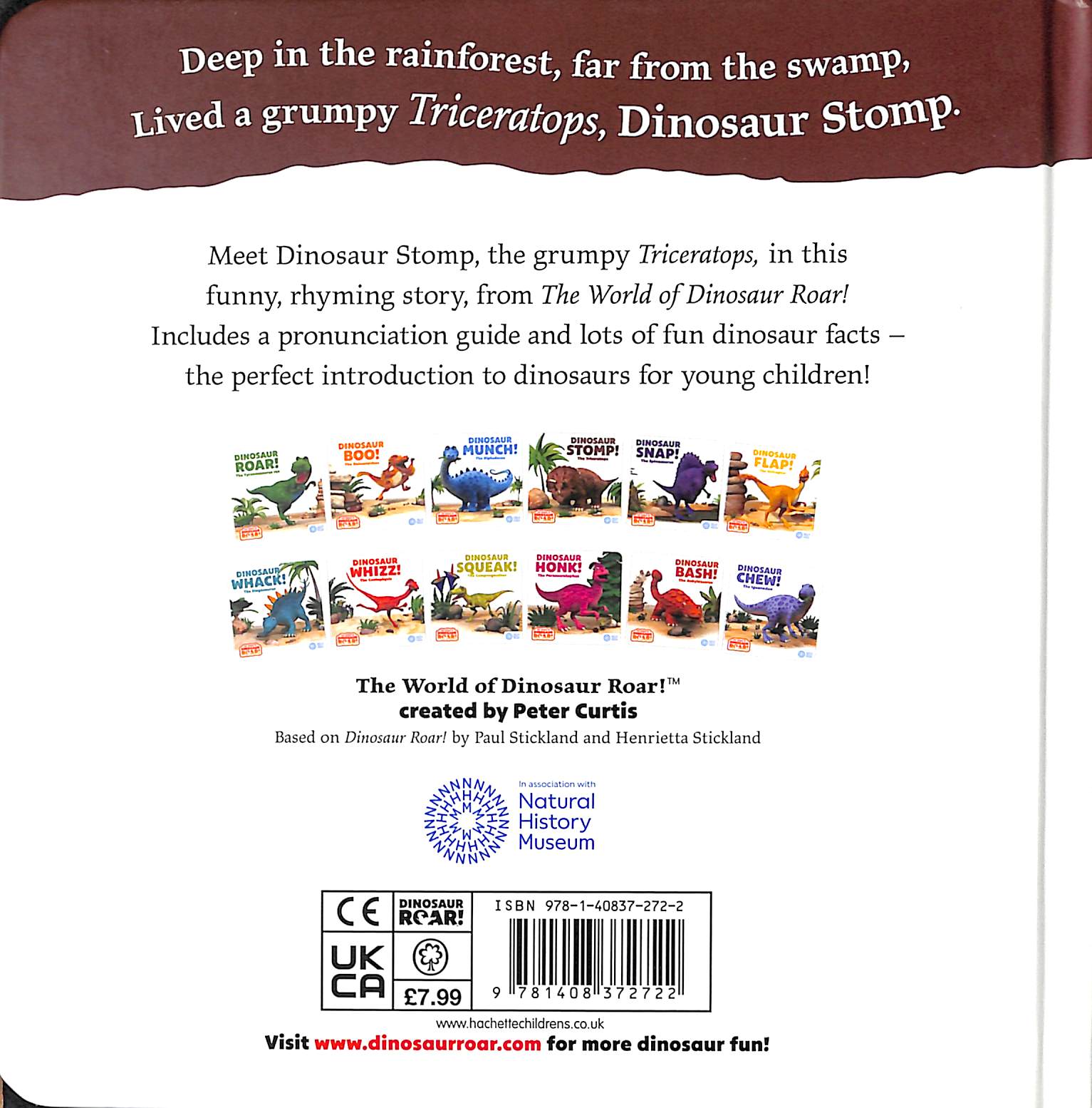 'Deep in the rainforest, far from the swamp, lived a grumpy Triceratops, Dinosaur Stomp.'Meet Dinosaur Stomp, the grumpy Triceratops, in this brilliant rhyming story, part of The World of Dinosaur Roar! collectable book series created by Peter Curtis, in association with the Natural History Museum. Dinosaur Stomp doesn't want to play with the other dinosaurs, all he wants is to be left alone . . . but sometimes even a grumpy Triceratops needs a friend!