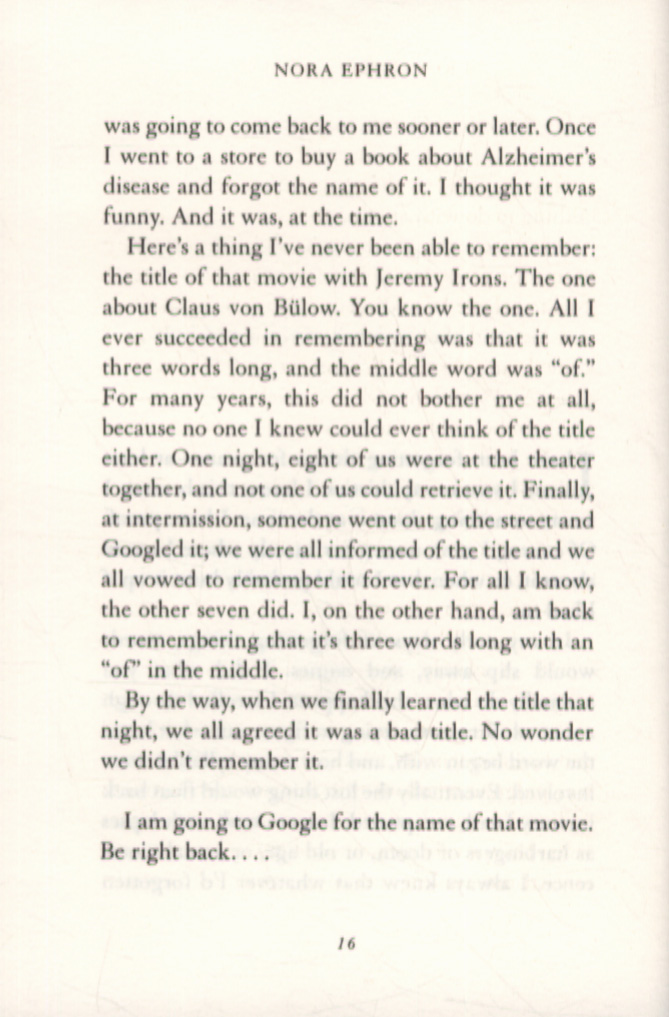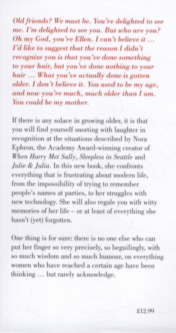If there is any solace in growing older, it is that you will find yourself guffawing in hysterical recognition at the situations Nora Ephron describes, from the impossibility of trying to remember people's names at parties,to struggling with the new technology. You will find yourself rolling off the sofa snorting with laughter as she recalls with her signature clarity and wisdom everything she hasn't (yet) forgotten, including what it feels like to produce a flop - and you will swallow down a lump in your throat at the poignancy of her insights into the pain of losing friends, and the guilt of separation and divorce.