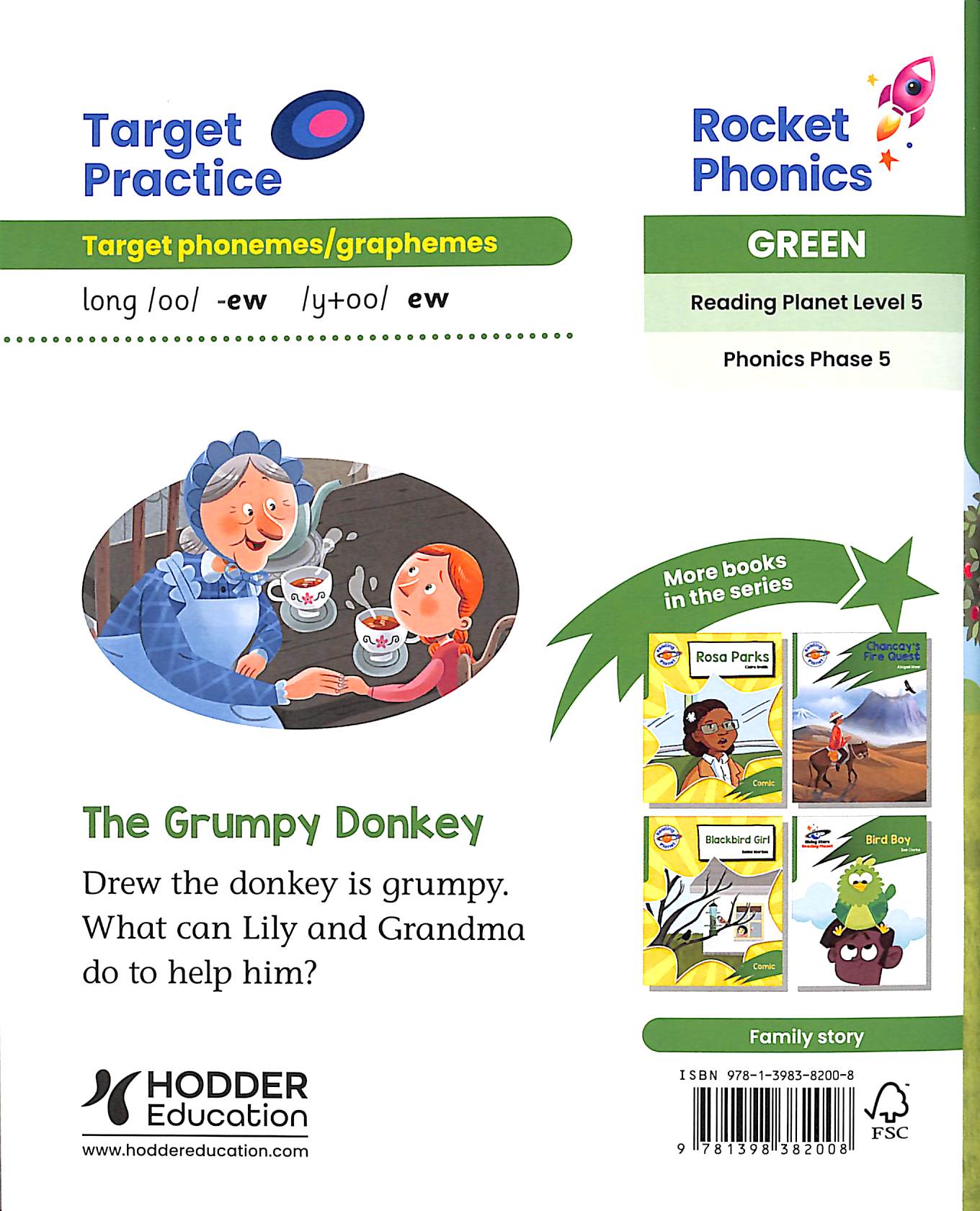 Can Matthew help cheer Drew up? (Letter-sounds featured: long /oo/ -ew /y+oo/ ew) The Grumpy Donkey is part of the Rocket Phonics systematic synthetic phonics programme from Reading Planet.