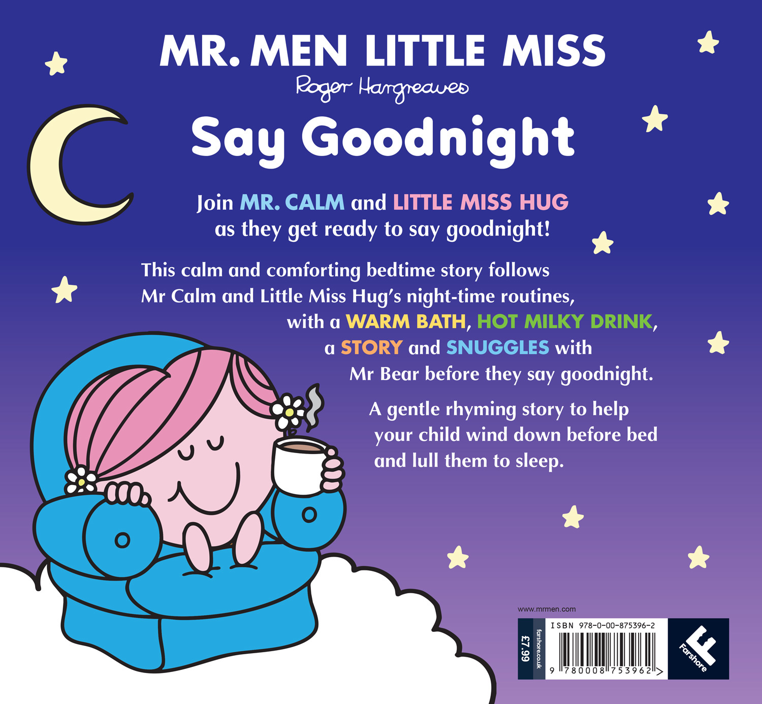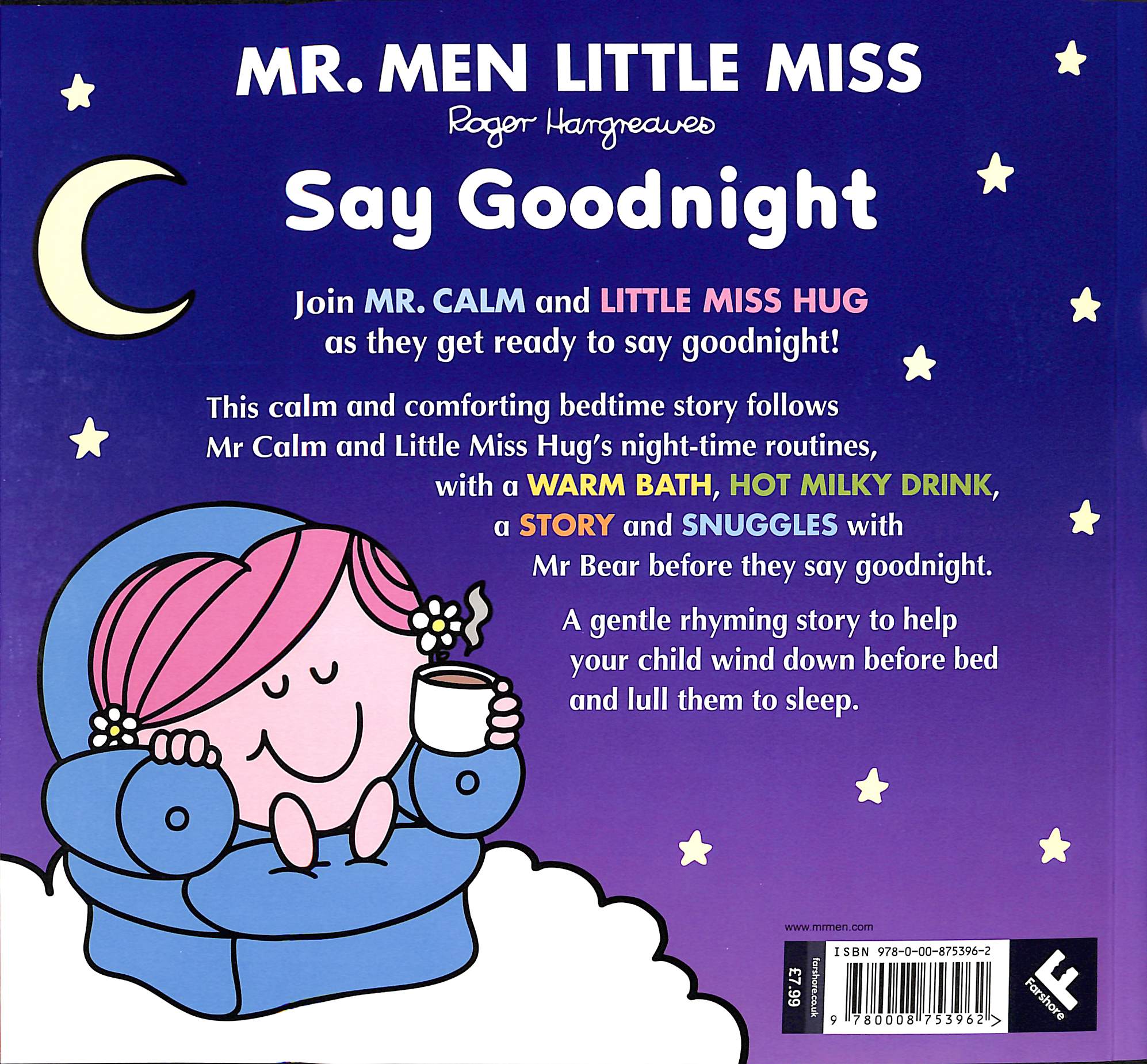 A brand new bedtime story following Mr Calm and Little Miss Hug’s bedtime routine In Happyland, the day is ending and it’s time to go to bed. Mr Calm and Little Miss Hug need to rest their sleepy heads. This calm and comforting bedtime story will help young children wind down before bed as they follow Mr Calm and Little Miss Hug’s night-time routines, with a warm bath, hot milk, a story and snuggles with Mr Bear before they say goodnight! The perfect gentle rhyming story to lull your child to sleep.
