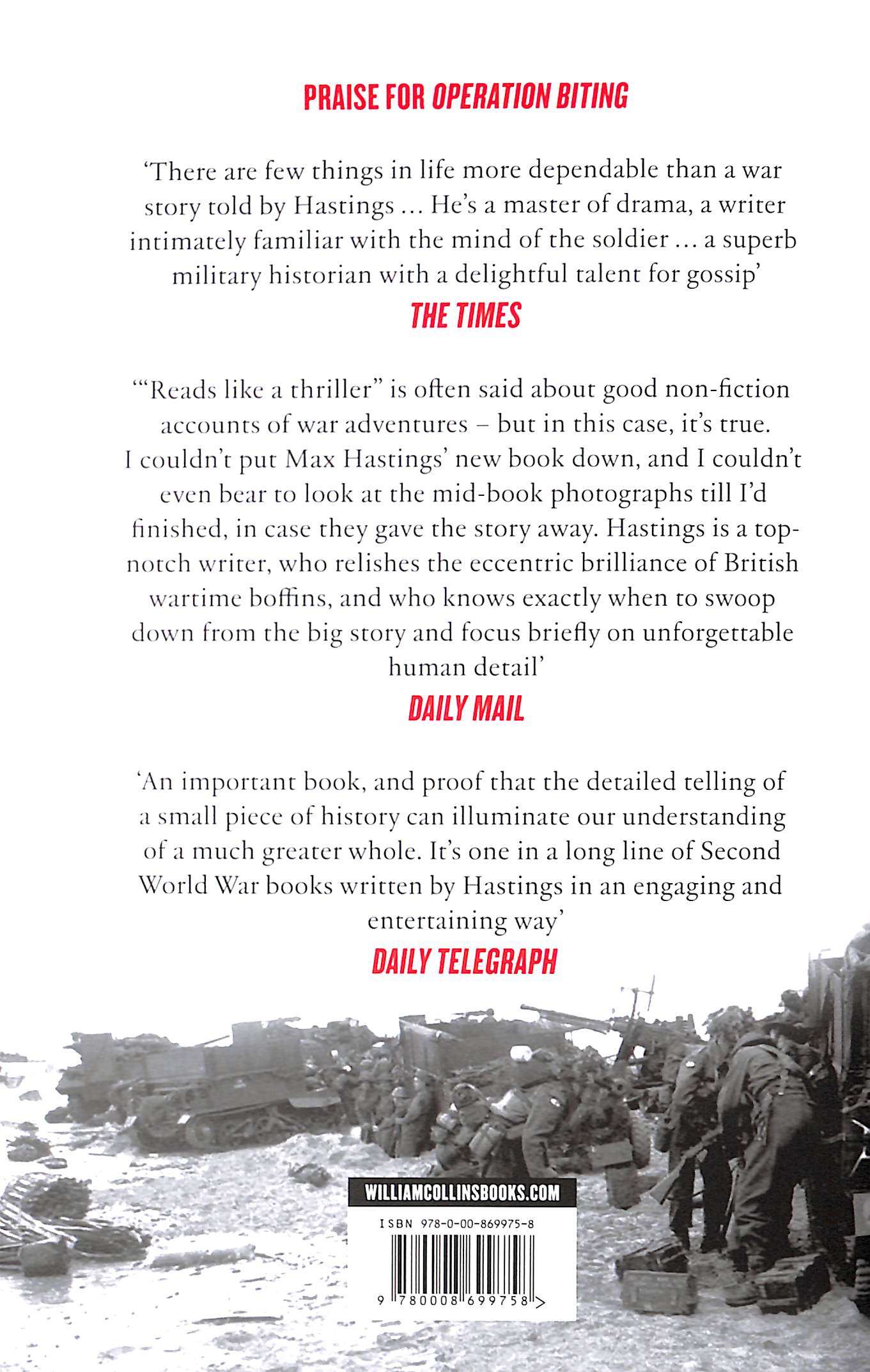 There is also a host of personal portraits of key figures from Commando leader Lord Lovat, famously brave but supremely arrogant, to Colonel Jim Eadie, whose tanks of the Staffordshire Yeomanry repulsed a panzer division in the last hours of 6 June, and some of the humbler participants to whom extraordinary things happened. This is the story of D-Day as you have never read it before, with the blend of narrative, analysis and human insight that made Max Hastings’ last book Operation Biting, like many of his earlier works, a Sunday Times No. 1 bestseller.
