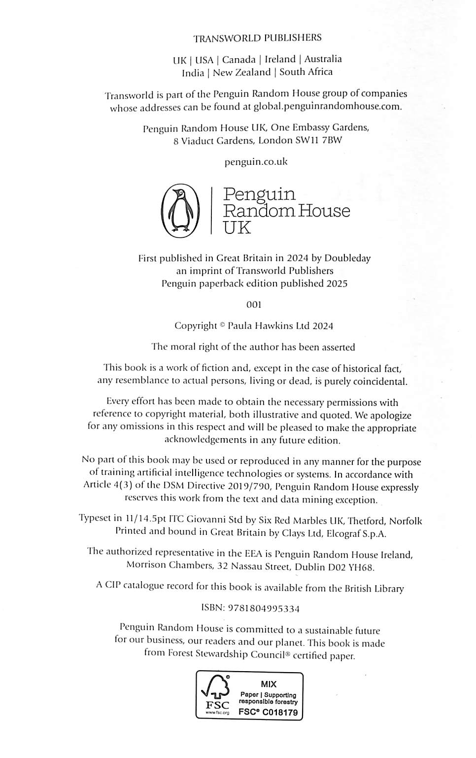 I absolutely LOVED it!’ 5-STAR READER REVIEW'Gorgeous and chilling.' SHARI LAPENA, bestselling author of She Didn't See it Coming‘Unnervingly unputdownable.’ Independent'The best Paula Hawkins yet - by a tense and haunting mile' LEE CHILD, bestselling author of the Jack Reacher series'Extremely hard to put down' MICK HERRON, bestselling author of Slow Horses'A twisty, dark thriller, this is Paula Hawkins' best book since The Girl on the Train' RED'Unforgiving and irresistible' VAL McDERMID, bestselling author of the detective Karen Pirie series'REALLY good.