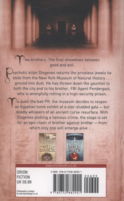 Diogenes, the psychotic killer who stole them in DANCE OF DEATH, is throwing down the gauntlet to both the city and to his brother, FBI Agent Pendergast, who is currently incarcerated in a maximum security prison. To quell the PR nightmare of the gem fiasco, the museum decides to reopen the Tomb of Senef.
