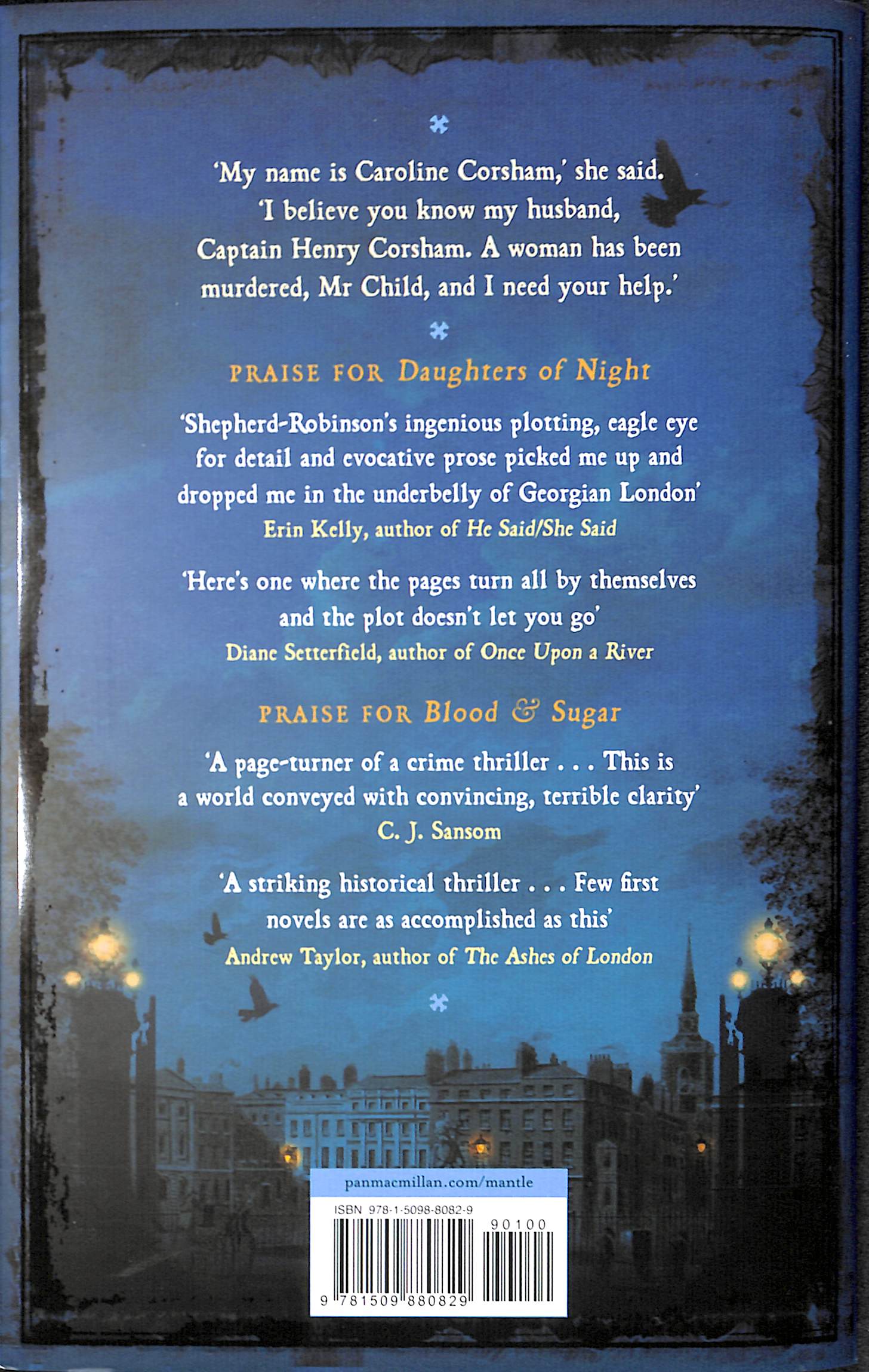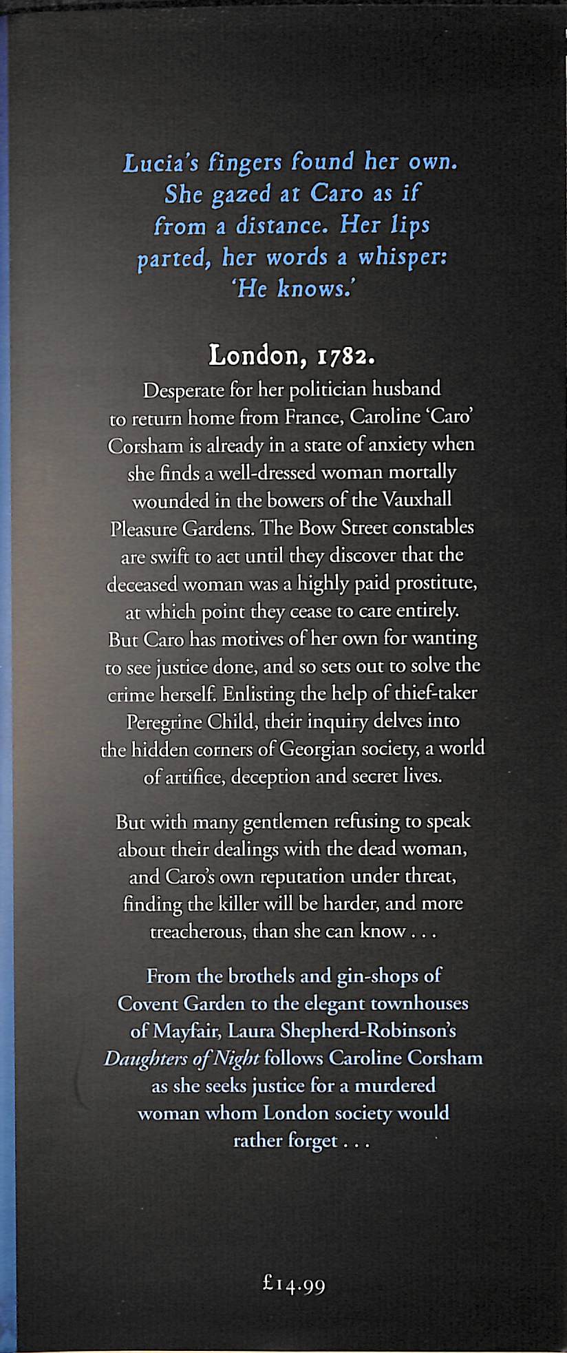 J. Sansom and Andrew Taylor' – Amanda Craig, author of The Golden RuleFrom the pleasure palaces and gin-shops of Covent Garden to the elegant townhouses of Mayfair, Laura Shepherd-Robinson’s Daughters of Night follows Caroline Corsham as she seeks justice for a murdered woman whom London society would rather forget . . . London, 1782. Desperate for her politician husband to return home from France, Caroline ‘Caro’ Corsham is already in a state of anxiety when she finds a well-dressed woman mortally wounded in the bowers of the Vauxhall Pleasure Gardens.
