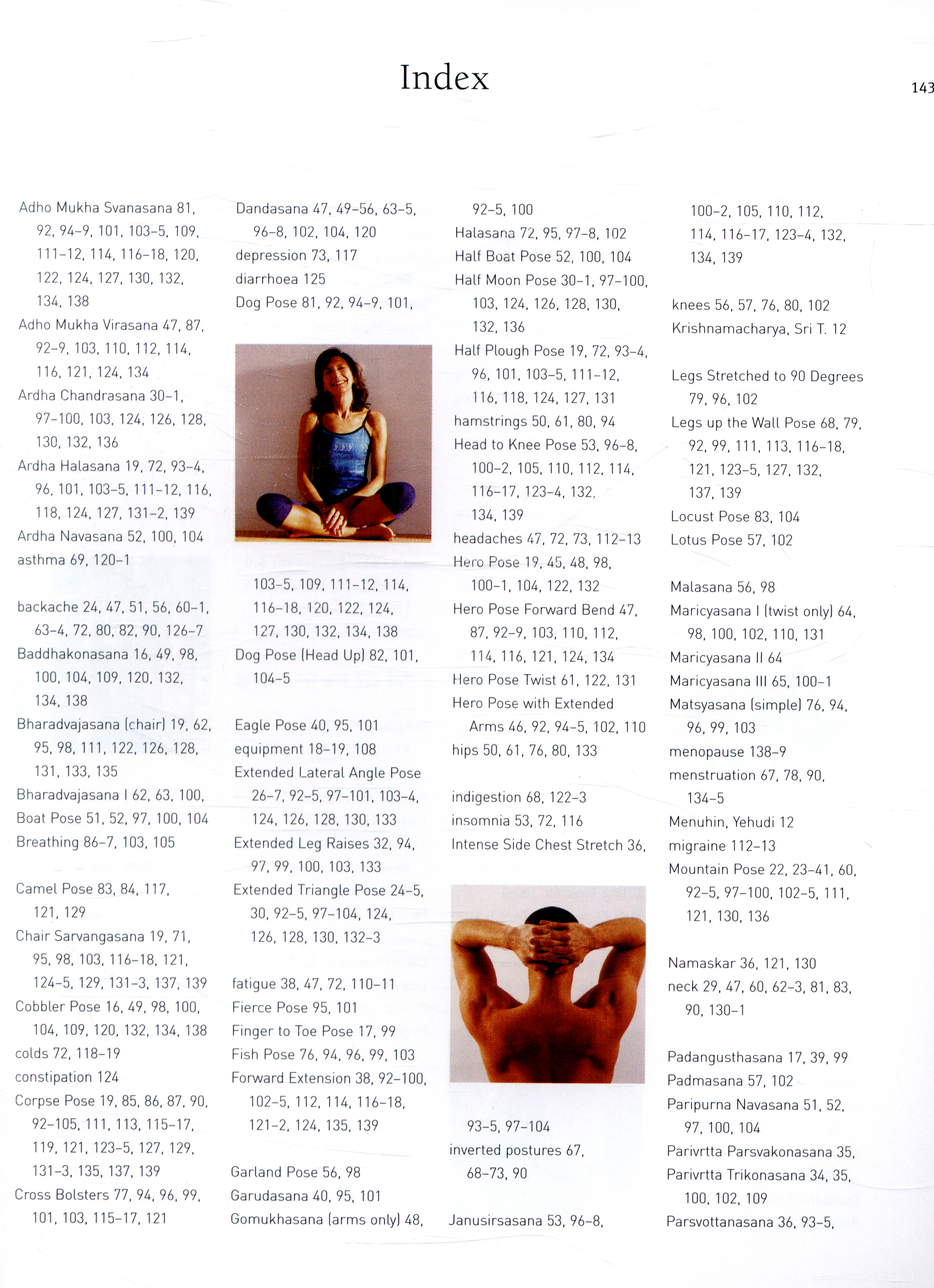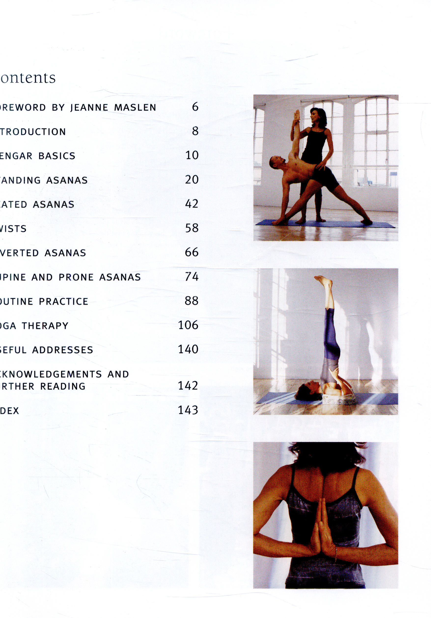 It includes Iyengar basics, standing asanas, seated asanas, twists, inverted asanas, supine and prone asanas, routine practice and yoga therapy.