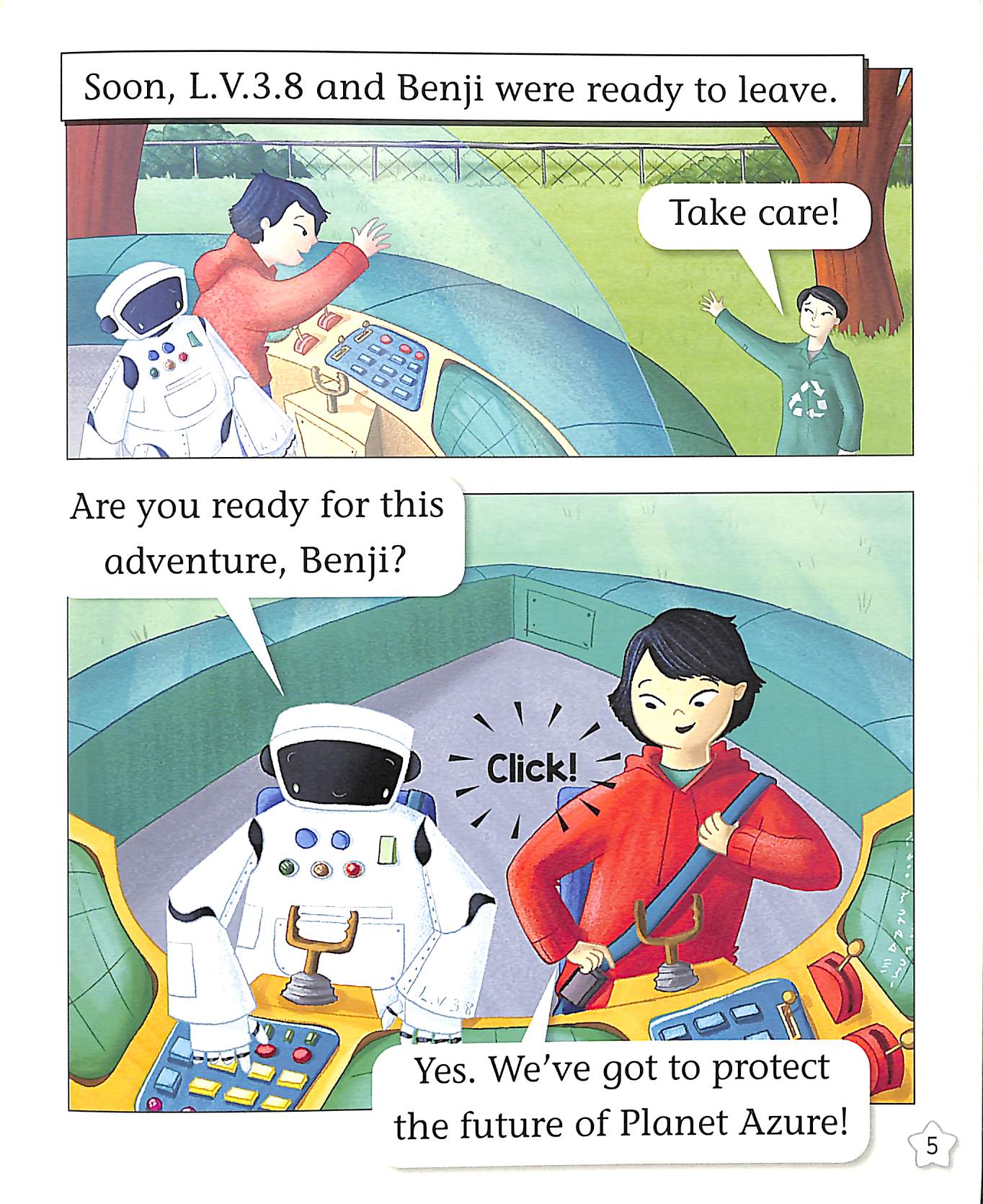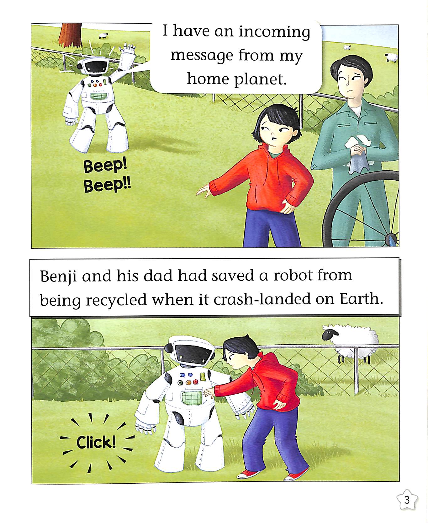 Benji lives on Earth with his dad and Robot L.V.3.8.