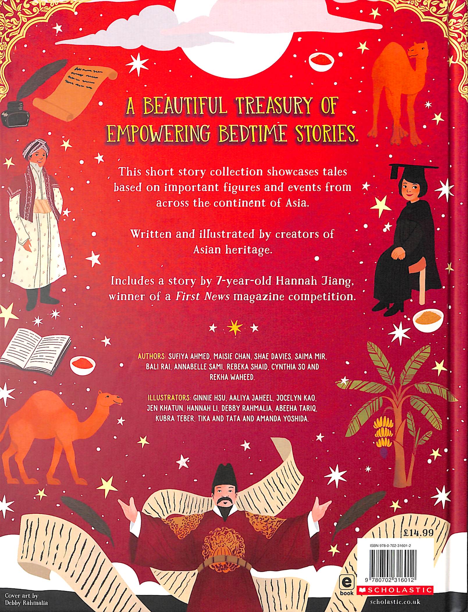 A beautiful, celebratory and joyful book of bedtime stories. Written and illustrated by creators with heritage from across the continent of Asia, Bedtime Stories showcases a curated collection of tales from Asian history, based on important figures and events. Each story is the ideal length to read at bedtime as well as any moment when young readers are looking for an inspirational read! Features one young reader's winning entry from the First News and Scholastic competition  An empowering and celebratory gift Perfect for any child wanting to learn more about history's untold stories. Beautifully illustrated throughout with lovely twinkly foil highlights on the hardback cover   Stories include those of: King Sejong the Great, a Korean King who invented an alphabet Julia Domna, a Syrian princess and Roman empress Margaret Lin Xavier, Thailand’s first female doctor Sake Deen Mohammed, the Indian man who brought shampooing and curry to Britain.   Written by: Sufiya Ahmed, Maisie Chan, Shae Davies, Saima Mir, Bali Rai, Annabelle Sami, Rebeka Shaid, Cynthia So and Rekha Waheed. Illustrated by: Ginnie Hsu, Aaliya Jaheel, Jocelyn Kao, Jennifer Khatun, Hannah Li, Debby Rahmalia, Abeeha Tariq, Kubra Teber, Tika and Tata and Amanda Yoshida.