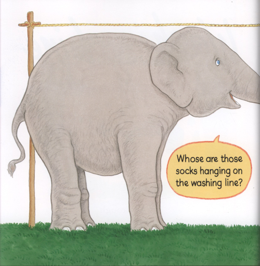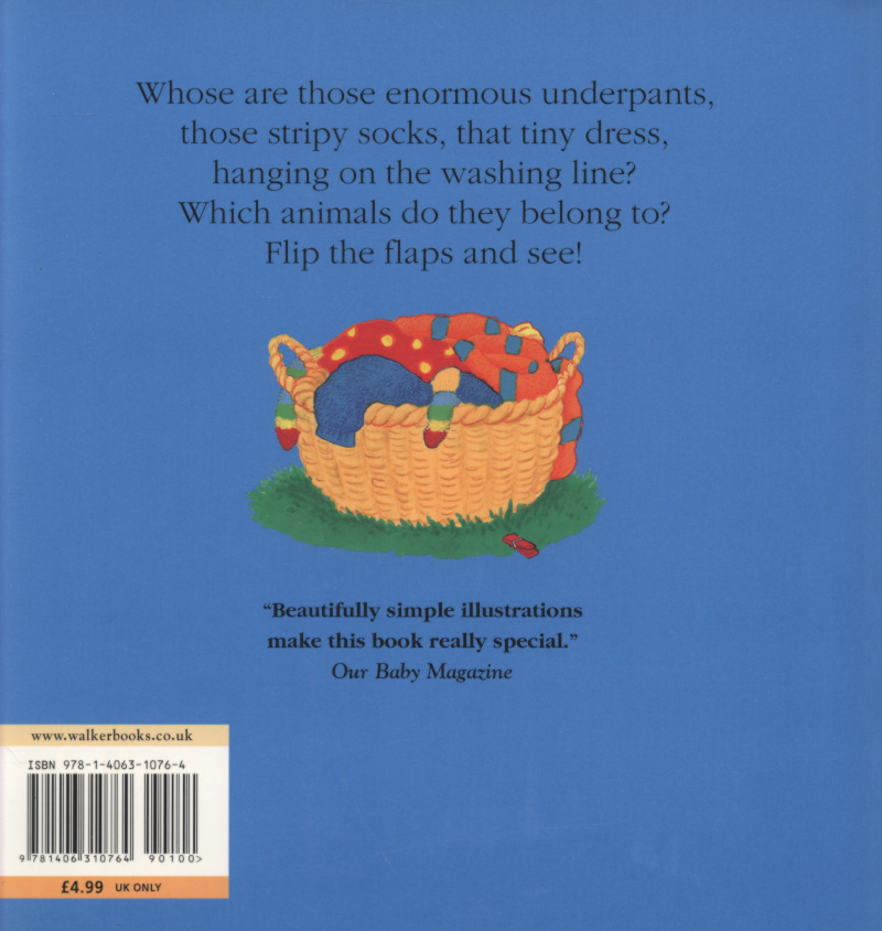 Guess which clothes belong to which animal in this fun flip-flap book from the creator of the bestselling Hug. Whose are those enormous underpants, those stripy socks, that tiny dress hanging on the washing line?