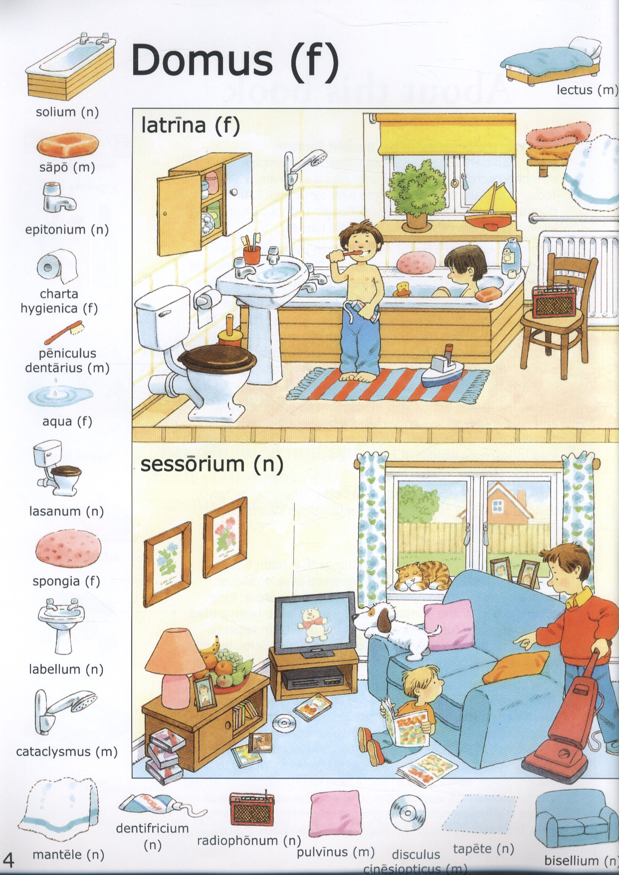 A Latin word book, illustrated with busy scenes and labelled pictures to help children learn key Latin vocabulary.