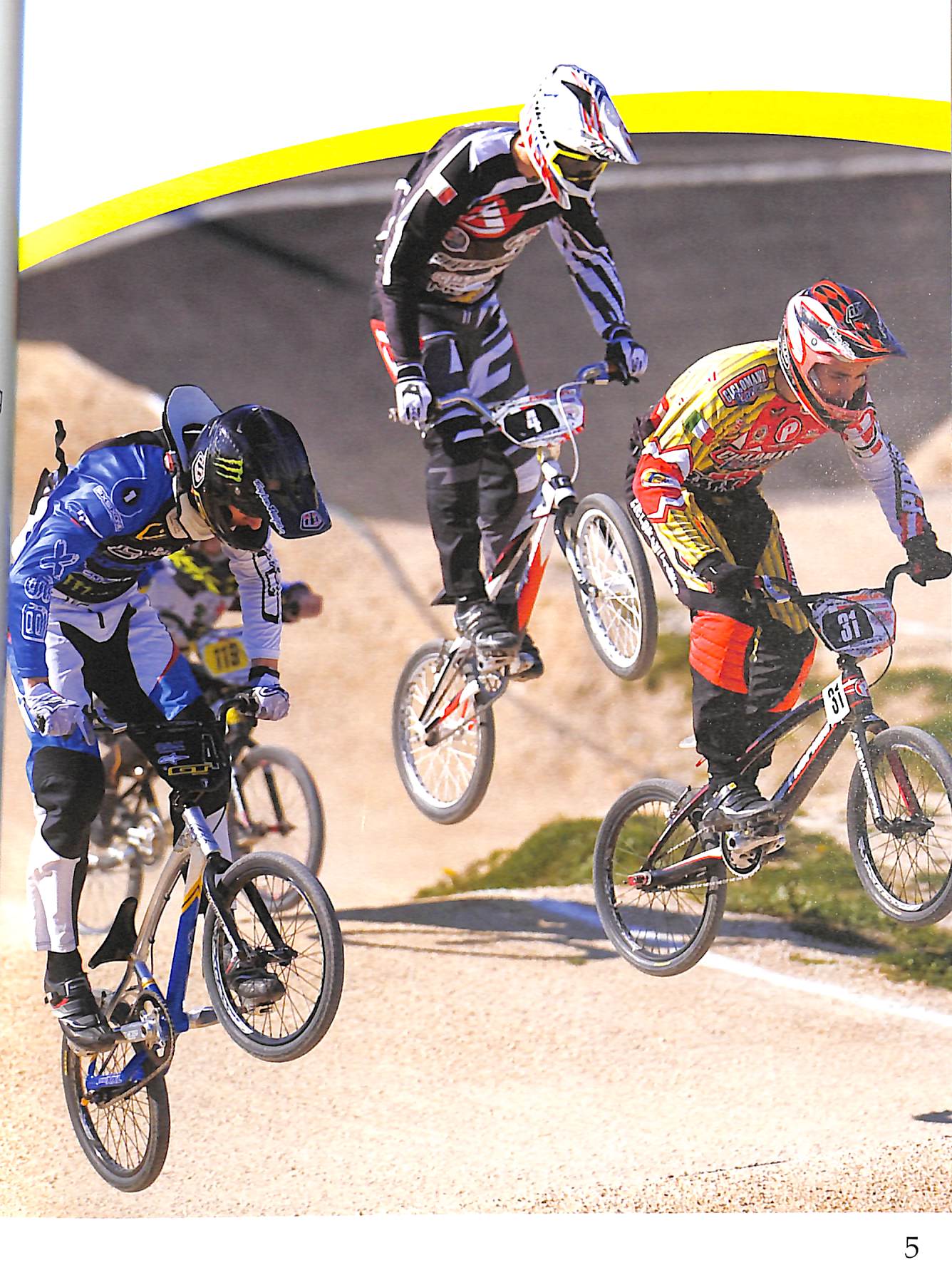 BMX bikes speed through courses and over big jumps.