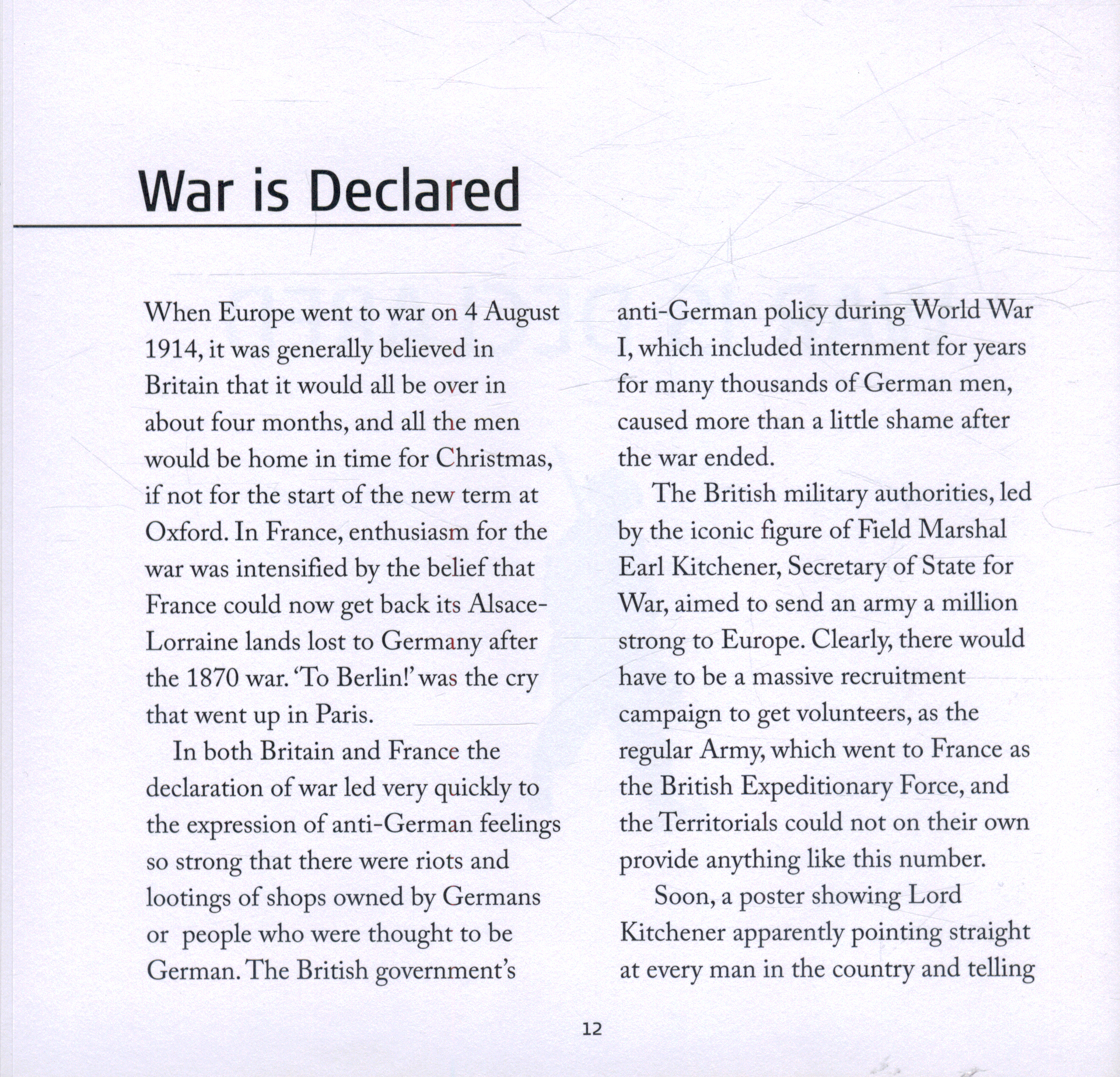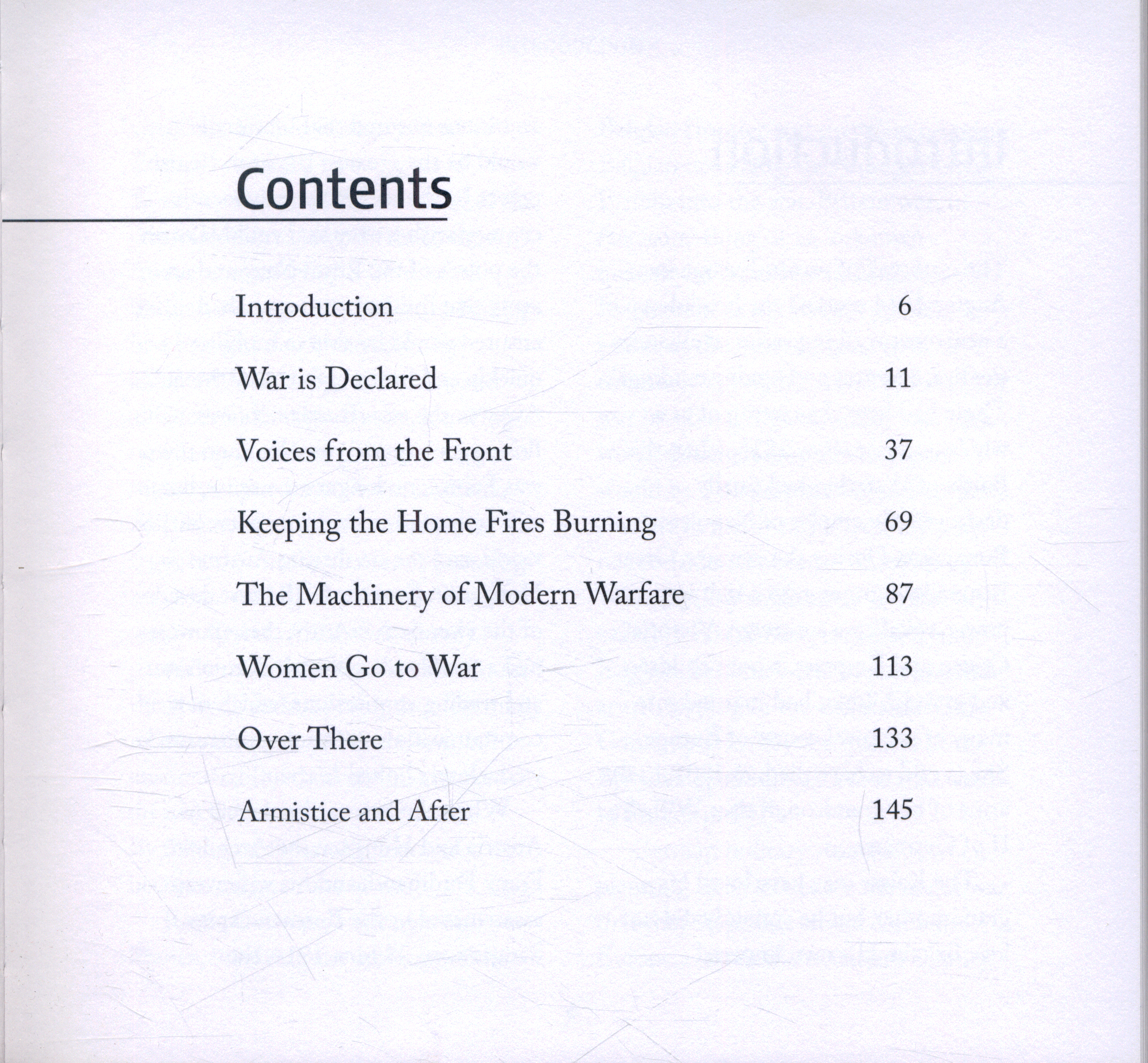 It is divided into seven chapters: War is Declared; Voices from the Front; Keeping the Home Fires Burning; The Machinery of Modern Warfare; Women Go to War; Over There; and Armistice and After.