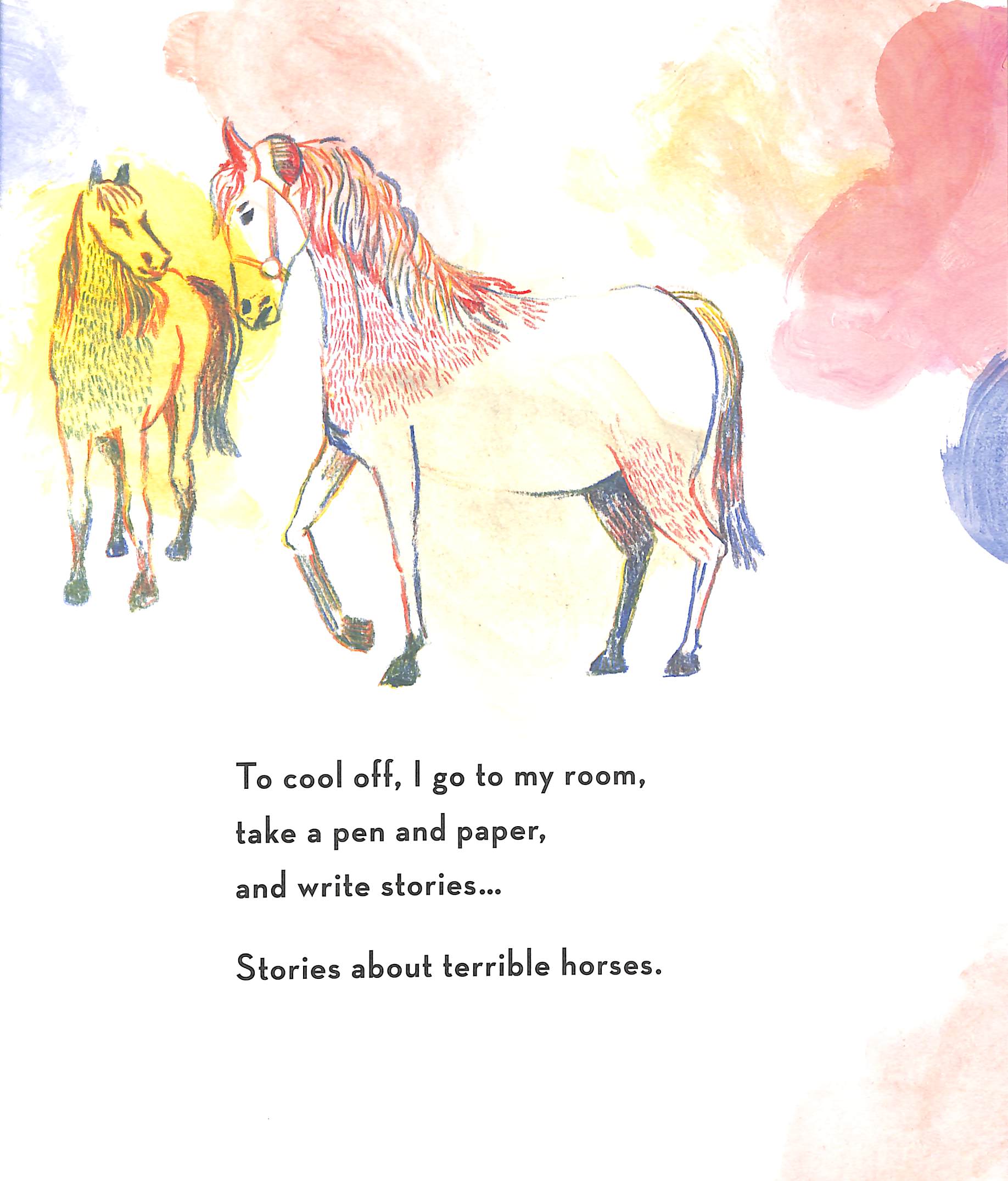 He writes stories about terrible horses – trampling and galloping – and he, a lone pony, who cannot compete and cannot speak.