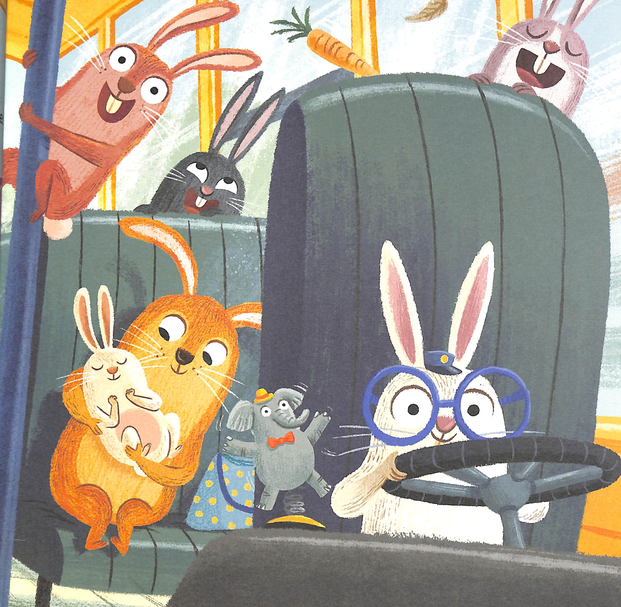 To be chanted at high speed and followed by a little lie-down."The bunnies have taken over the bus and they're on a wild ride across the streets of Sunny Town!