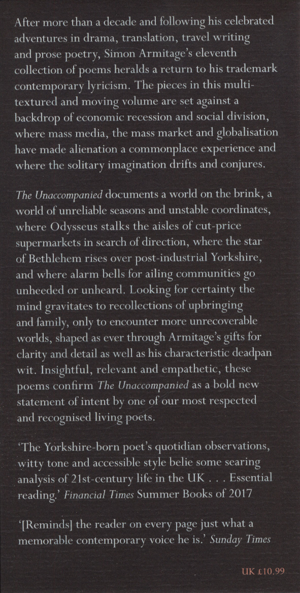 The Unaccompanied documents a world on the brink, a world of unreliable seasons and unstable coordinates, where Odysseus stalks the aisles of cut-price supermarkets in search of direction, where the star of Bethlehem rises over industrial Yorkshire, and where alarm bells for ailing communities go unheeded or unheard.