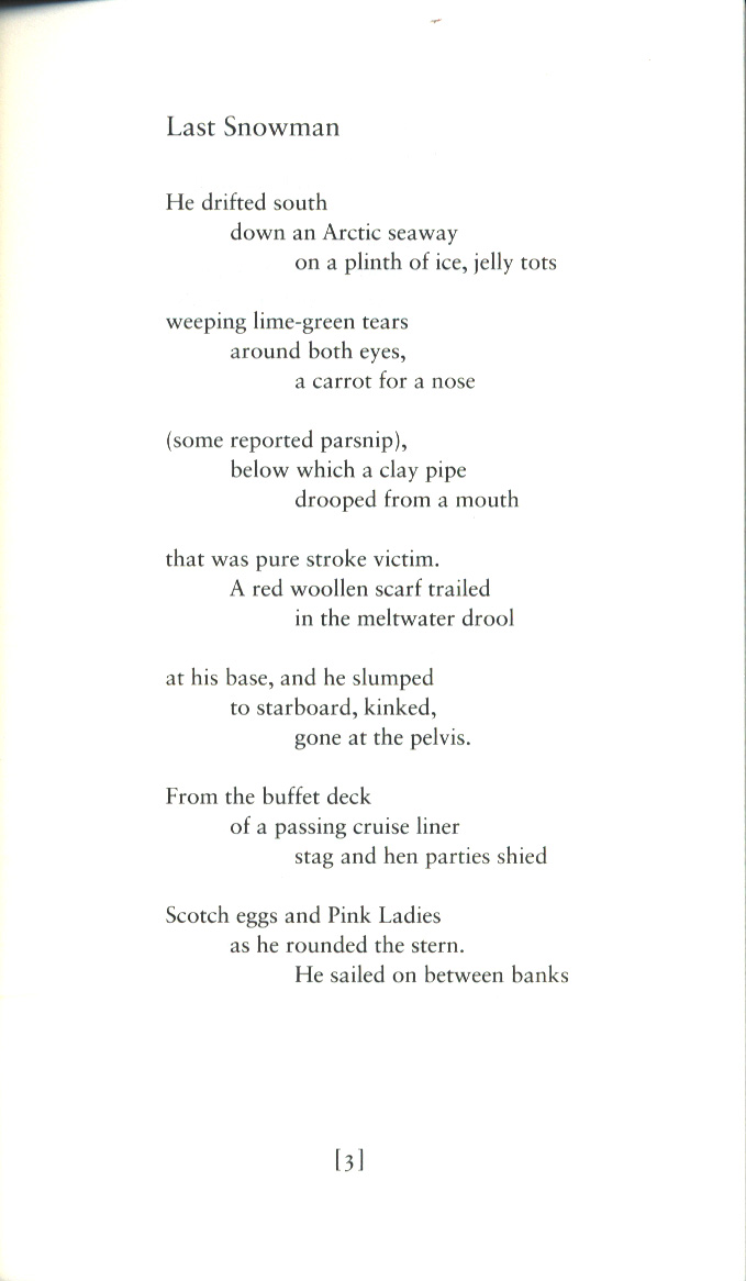 The pieces in this multi-textured and moving volume are set against a backdrop of economic recession and social division, where mass media, the mass market and globalisation have made alienation a commonplace experience and where the solitary imagination drifts and conjures.