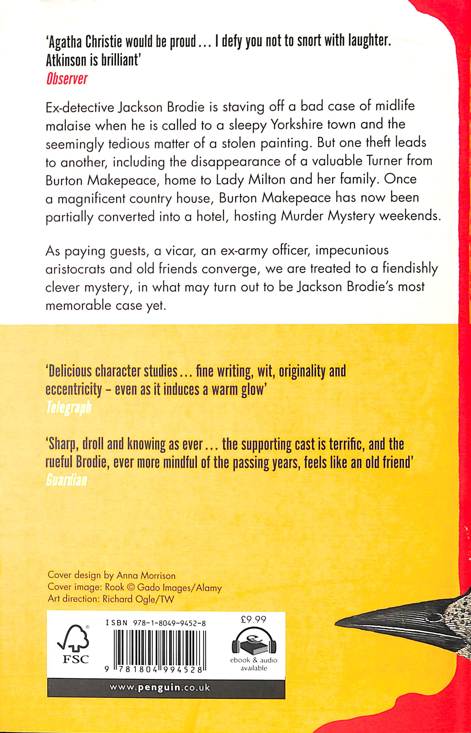 Atkinson is brilliant' Observer*****Welcome to Rook Hall. The stage is set. The players are ready. By night’s end, a murderer will be revealed. Ex-detective Jackson Brodie is staving off a bad case of midlife malaise when he is called to a sleepy Yorkshire town, and the seemingly tedious matter of a stolen painting. But one theft leads to another, including the disappearance of a valuable Turner from Burton Makepeace, home to Lady Milton and her family. Once a magnificent country house, Burton Makepeace has now partially been converted into a hotel, hosting Murder Mystery weekends. As paying guests, a vicar, an ex-army officer, impecunious aristocrats, and old friends converge, we are treated a fiendishly clever mystery; one that pays homage to the masters of the genre—from Agatha Christie to Dorothy Sayers. Brilliantly inventive, with all of Atkinson’s signature wit, wordplay and narrative brio, Death at the Sign of the Rook may be Jackson Brodie’s most outrageous and memorable case yet. ****'Sharp, droll and knowing as ever, Atkinson has huge fun with the set-up; the supporting cast is terrific, and the rueful Brodie, ever more mindful of the passing years, feels like an old friend.' Guardian‘Delicious character studies… fine writing, wit, originality and eccentricity – even as it induces a warm glow’ Telegraph'Another brilliant addition to her impressive oeuvre, Atkinson masterfully blends intricate plotting with rich character development, delivering a mystery that is both intellectually stimulating and emotionally engaging.’ Glamour‘The set-up is a delight, paying homage to traditional Agatha Christie-style murder mysteries – the characters are well-drawn, their stories unfolding alongside each other until gradually the strands unite, keeping the reader guessing how they will ultimately tie together.