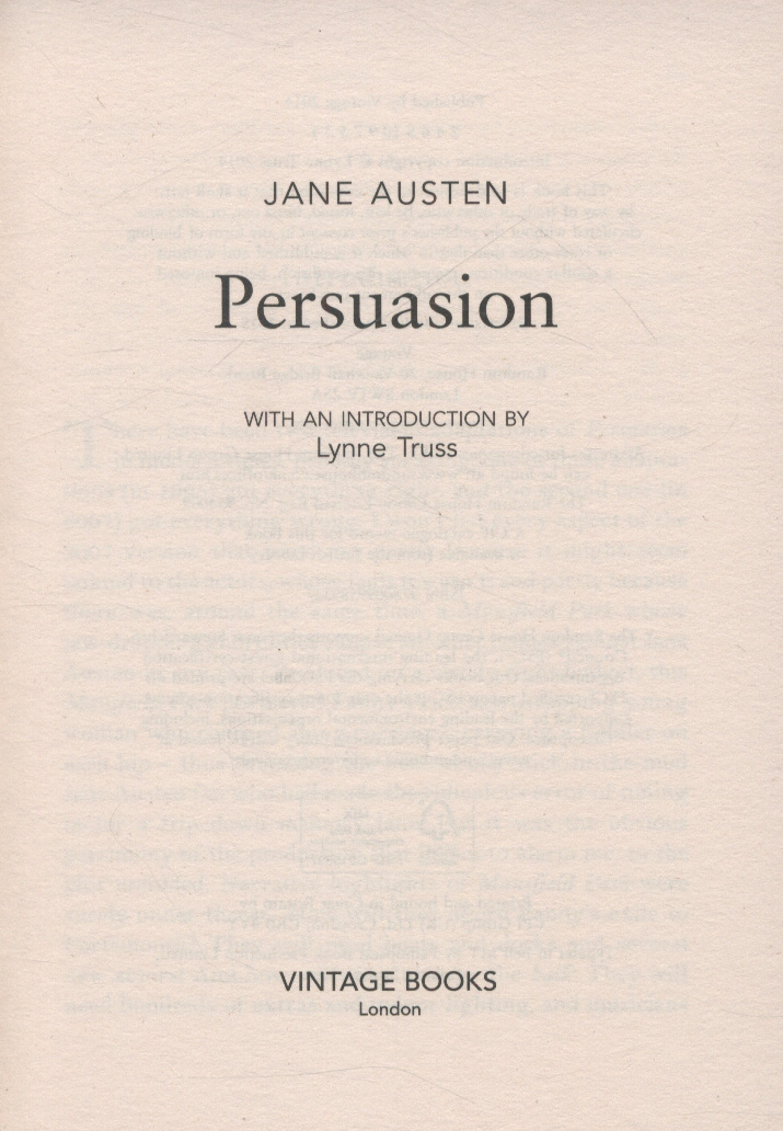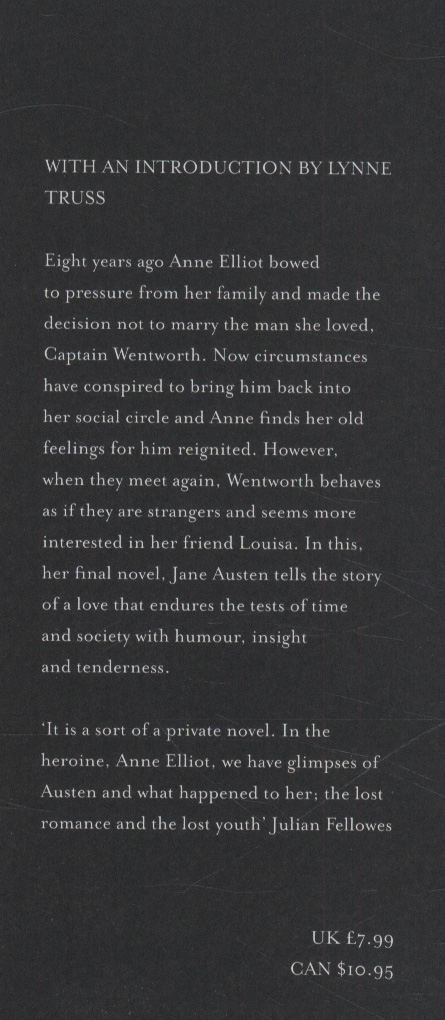In this, her final novel, Jane Austen tells the story of a love that endures the tests of time and society with humour, insight and tenderness. WITH AN INTRODUCTION BY LYNNE TRUSS VINTAGE CLASSICS AUSTEN SERIES - all six of Jane Austen's major novels, beautifully designed and introduced by our finest contemporary writers.