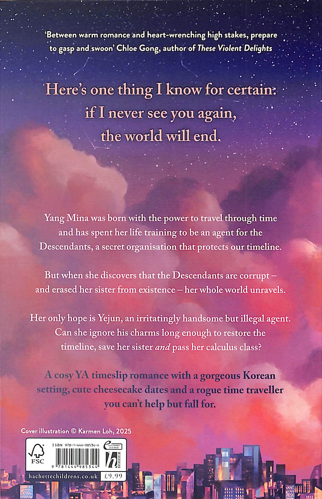 Before the Coffee Gets Cold meets KPop Demon Hunters in this cosy YA timeslip romance with a gorgeous Korean setting, cute cheesecake dates and a rogue time traveller you can't help but fall for. Here's one thing I know for certain: if I never see you again, the world will end. Yang Mina was born with the power to travel through time and has spent her life training to be an agent for the Descendants, a secret organisation which protects our timeline.