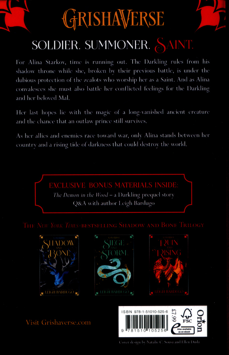 Perfect for fans of Laini Taylor and Sarah J. Maas. Now with a stunning new cover and exclusive bonus material: The Demon in the Wood (a Darkling prequel story) and a Q&A with Leigh Bardugo. Soldier. Summoner. Saint.The nation's fate rests with a broken Sun Summoner, a disgraced tracker, and the shattered remnants of a once-great magical army. The Darkling rules from his shadow throne while a weakened Alina Starkov recovers from their battle under the dubious protection of the zealots who worship her as a Saint.