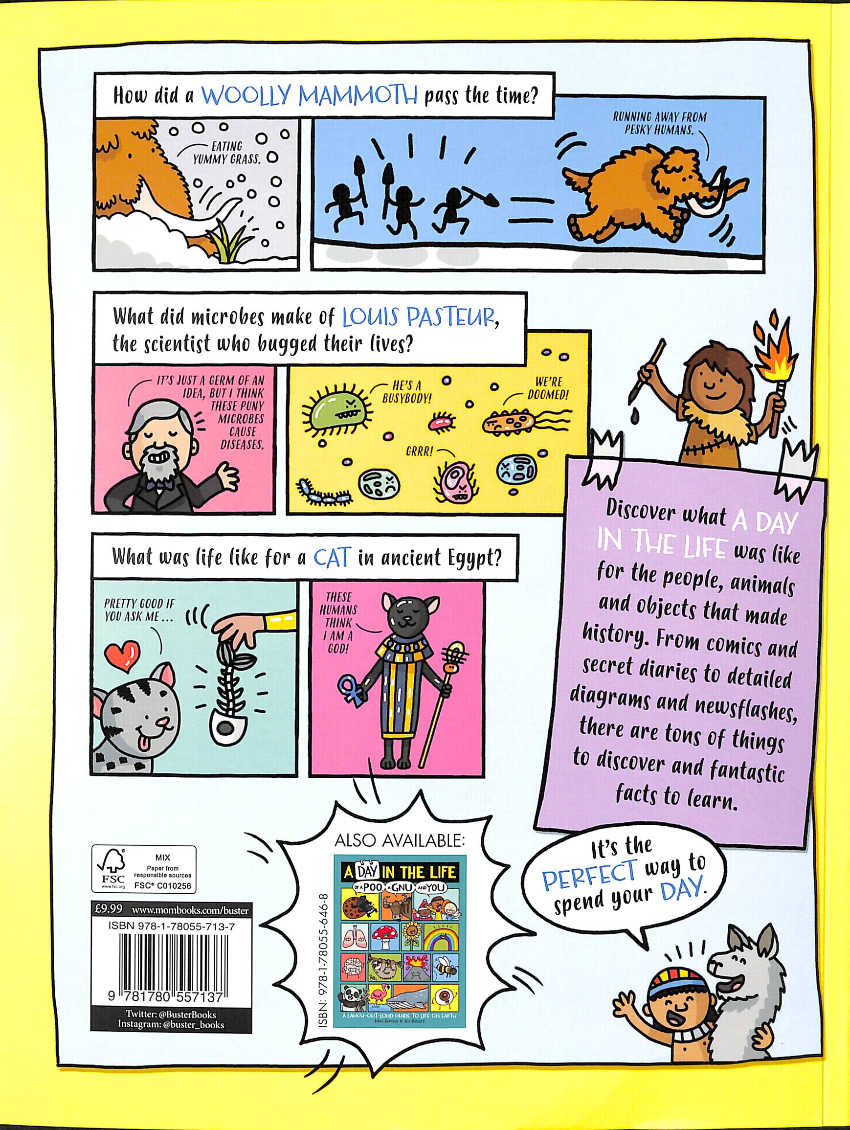 Shortlisted for the Lollies 2023__________________________A colourful and comical tour through history from cartoonists Mike Barfield and Jess Bradley. The hilarious minds behind A Day in the Life of a Poo, a Gnu and You have teamed up once again – this time to give a taste of the daily lives of the people, animals and objects who made history. Featuring a day in the life of early humans as they paint mammoths on the walls of a cave, a fierce gladiator battling in the Colosseum and the first woman in space. And not forgetting the animals of history – from an Egyptian cat (worshipped as a god, of course) to an albatross flying over Rapa Nui and a dog in the trenches of the First World War. Readers can also discover the stories behind famous constructions, including the Great Wall of China and Shakespeare’s Globe Theatre, and delve into the secret diaries of a Viking, Isaac Newton’s cat and the wooden panel that became the Mona Lisa. With over 90 entries told in the friendly, informative style of Mike Barfield and brought to life by Jess Bradley’s brilliantly funny illustrations, this book will have children learning and laughing as they go.