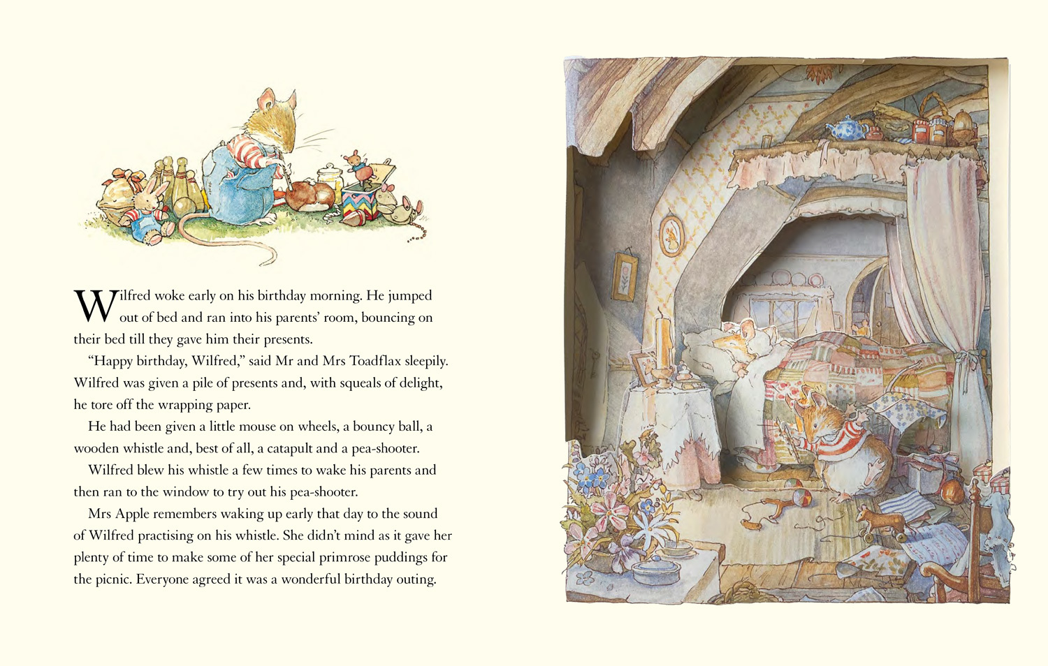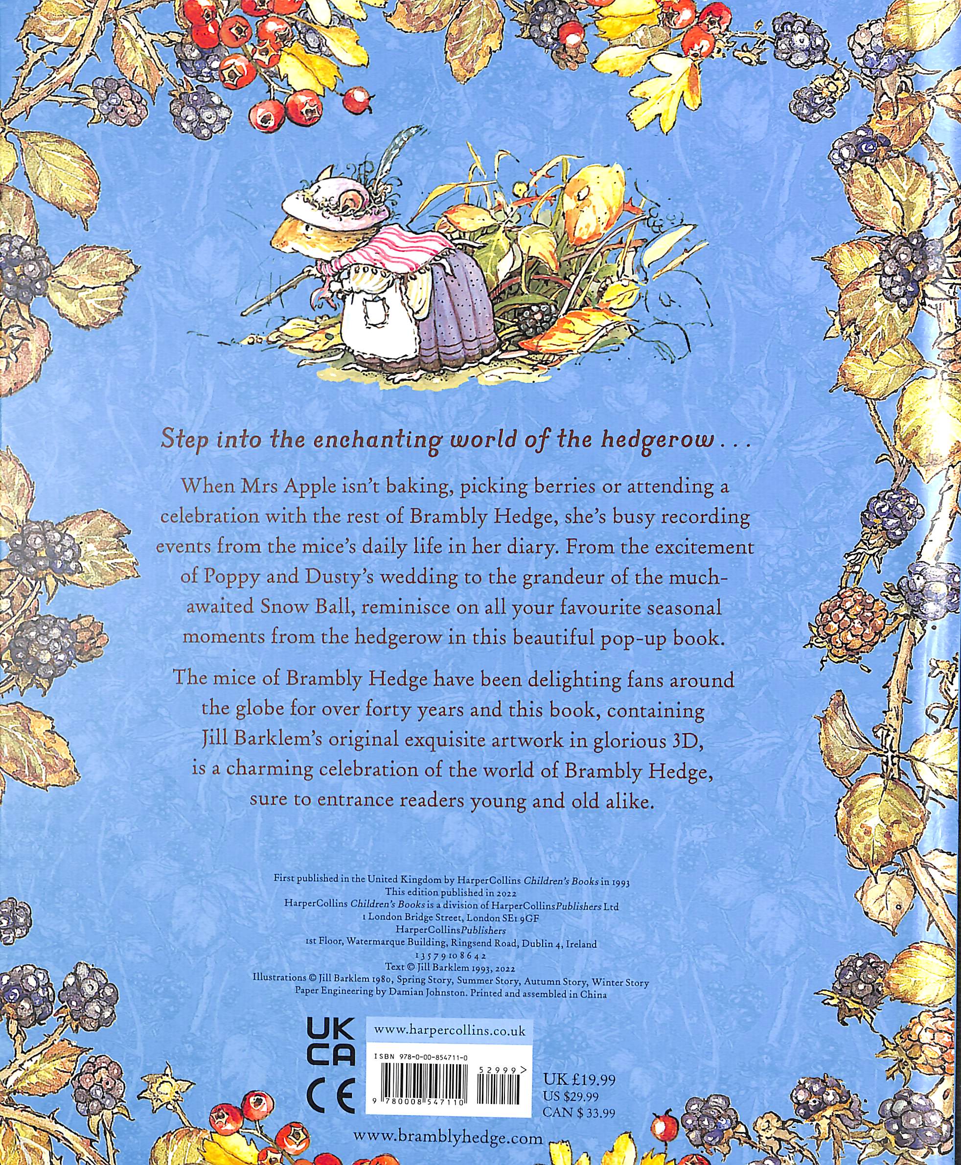 Step into the enchanting world of the hedgerow as never before in this exquisite Brambly Hedge Pop-Up book… When Mrs Apple isn’t baking, picking berries or attending a celebration with the rest of Brambly Hedge, she’s busy recording events from the mice’s daily life in her diary. From the excitement of Poppy and Dusty’s wedding to the grandeur of the much-awaited Snow Ball, reminisce on all your favourite seasonal moments from the hedgerow in this beautiful pop-up book. The mice of Brambly Hedge have been delighting fans all over the globe for over forty years and this book, containing Jill Barklem’s original exquisite artwork in glorious 3D, is a charming celebration of the world of Brambly Hedge, sure to entrance readers young and old alike.