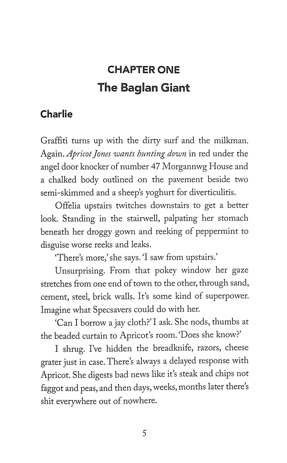 One morning Apricot Jones wakes up to graffiti on her front door and a man in a black Jaguar who calls himself the Baglan Giant looking for her mum.