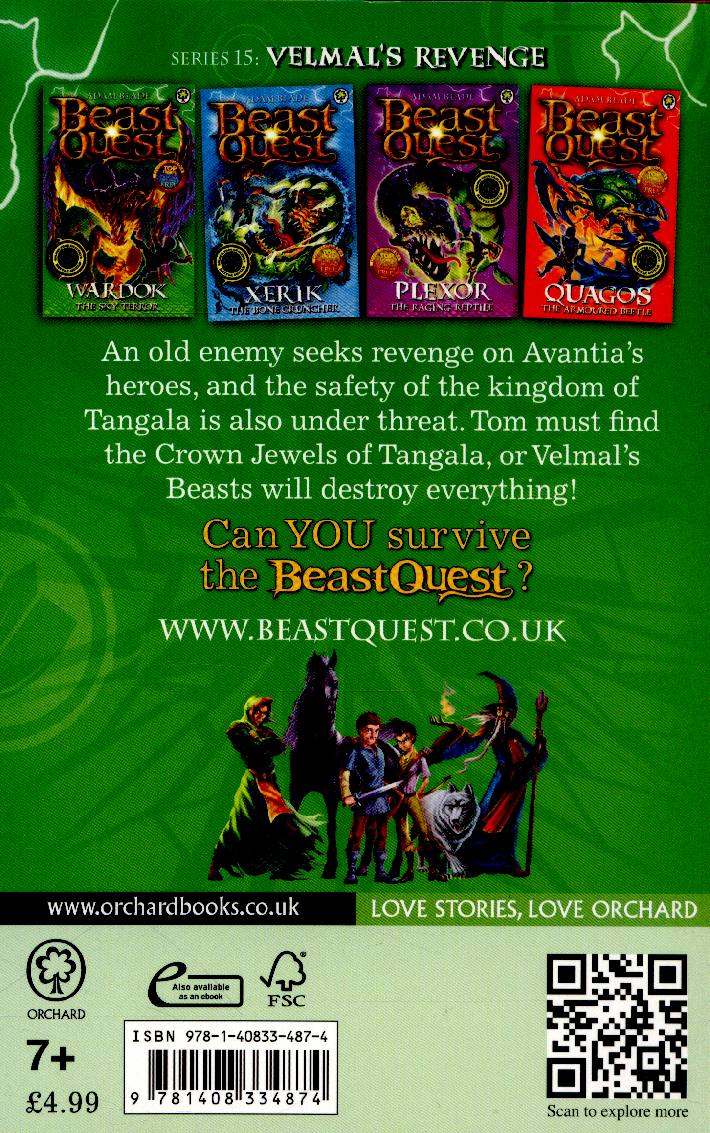 Tom must find the Crown Jewels of Tangala, or Velmal's Beasts will destroy everything!There are FOUR thrilling adventures to collect in the Beast Quest: Velmal's Revenge series: Wardok the Sky Terror; Xerik the Bone Cruncher; Plexor the Raging Reptile; Quagos the Armoured Beetle. If you like Beast Quest, check out Adam Blade's other series: Team Hero, Sea Quest and Beast Quest: New Blood!