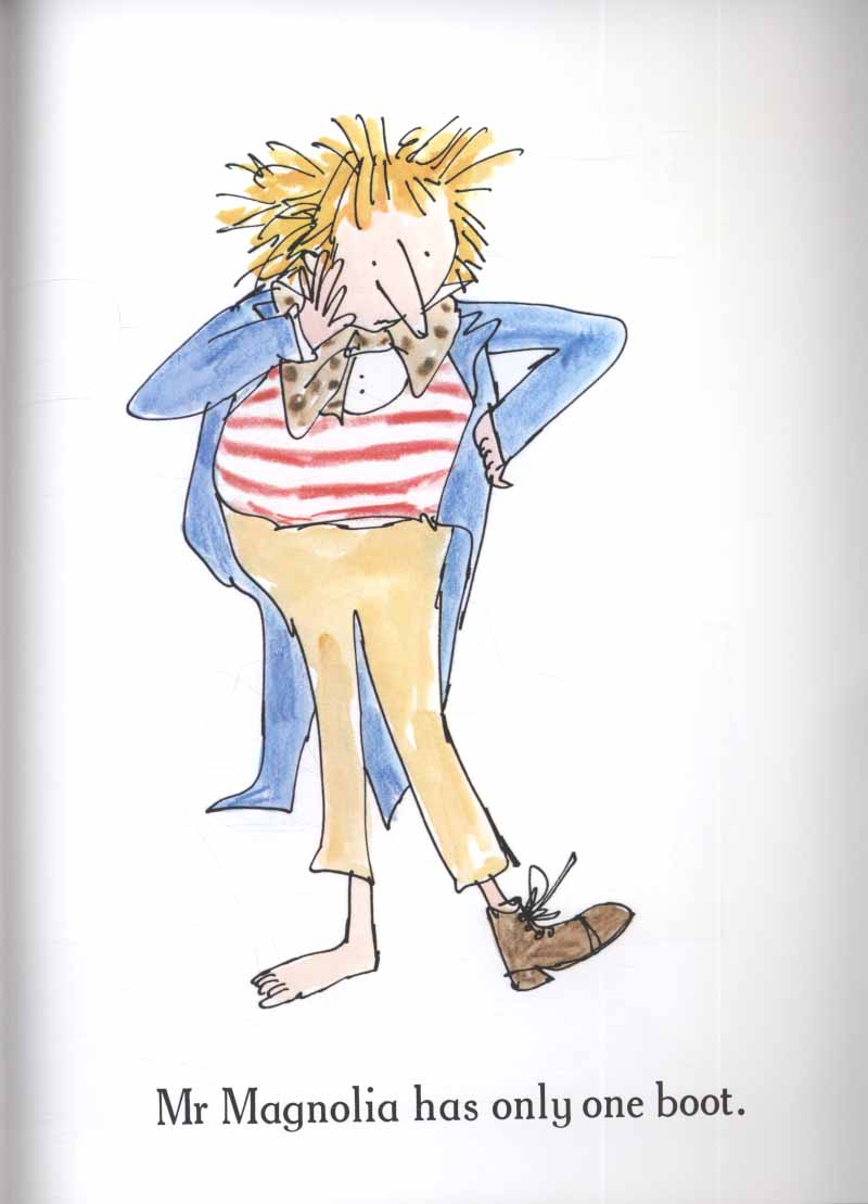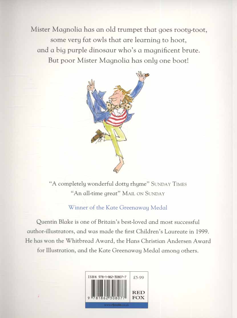 A classic, exuberant, rhyming picture book from the much-loved Quentin Blake. Mr Magnolia has only one boot. He has an old trumpet that goes rooty-toot -And two lovely sisters who play on the flute -But Mr Magnolia has only one boot. In this wittily rhyming picture book, Mr Magnolia has a full and happy life except for one serious omission - a boot.