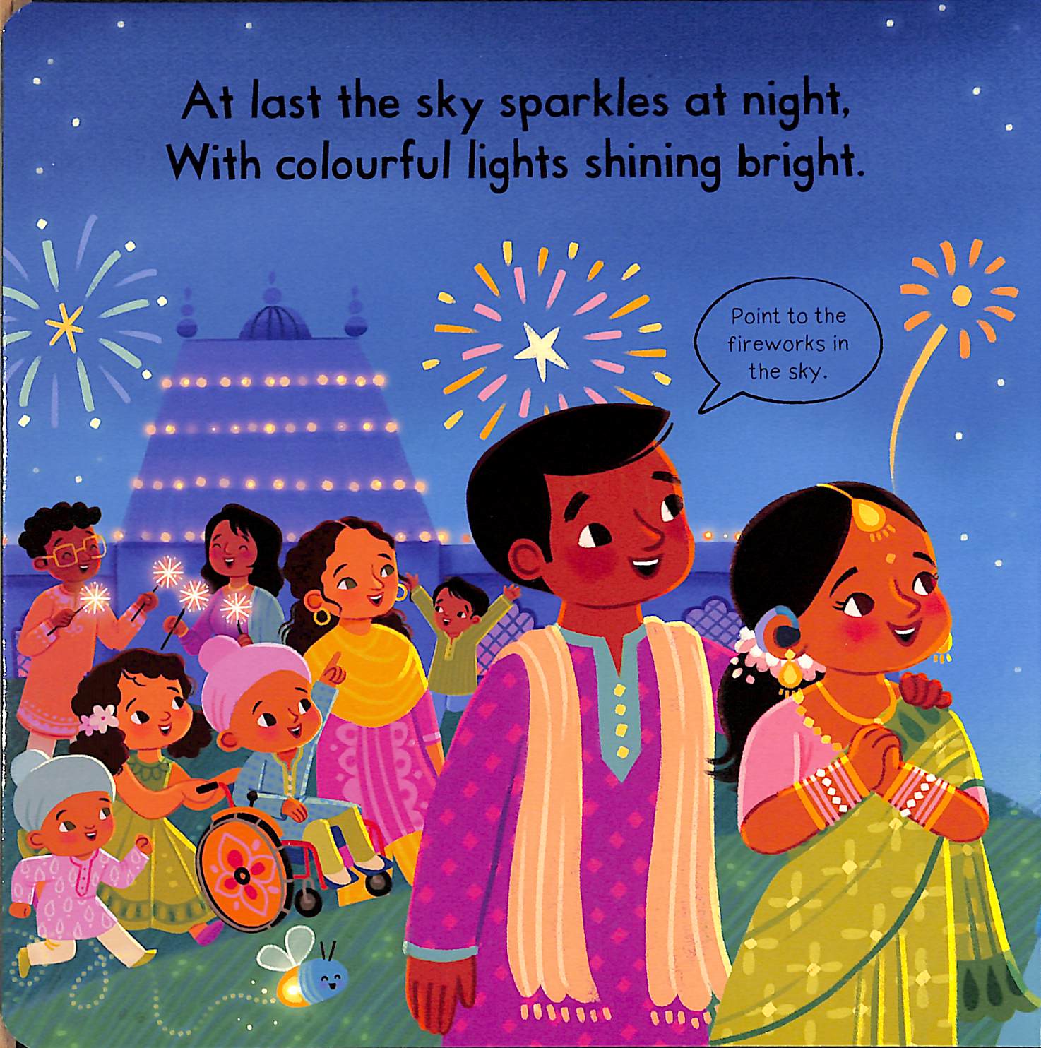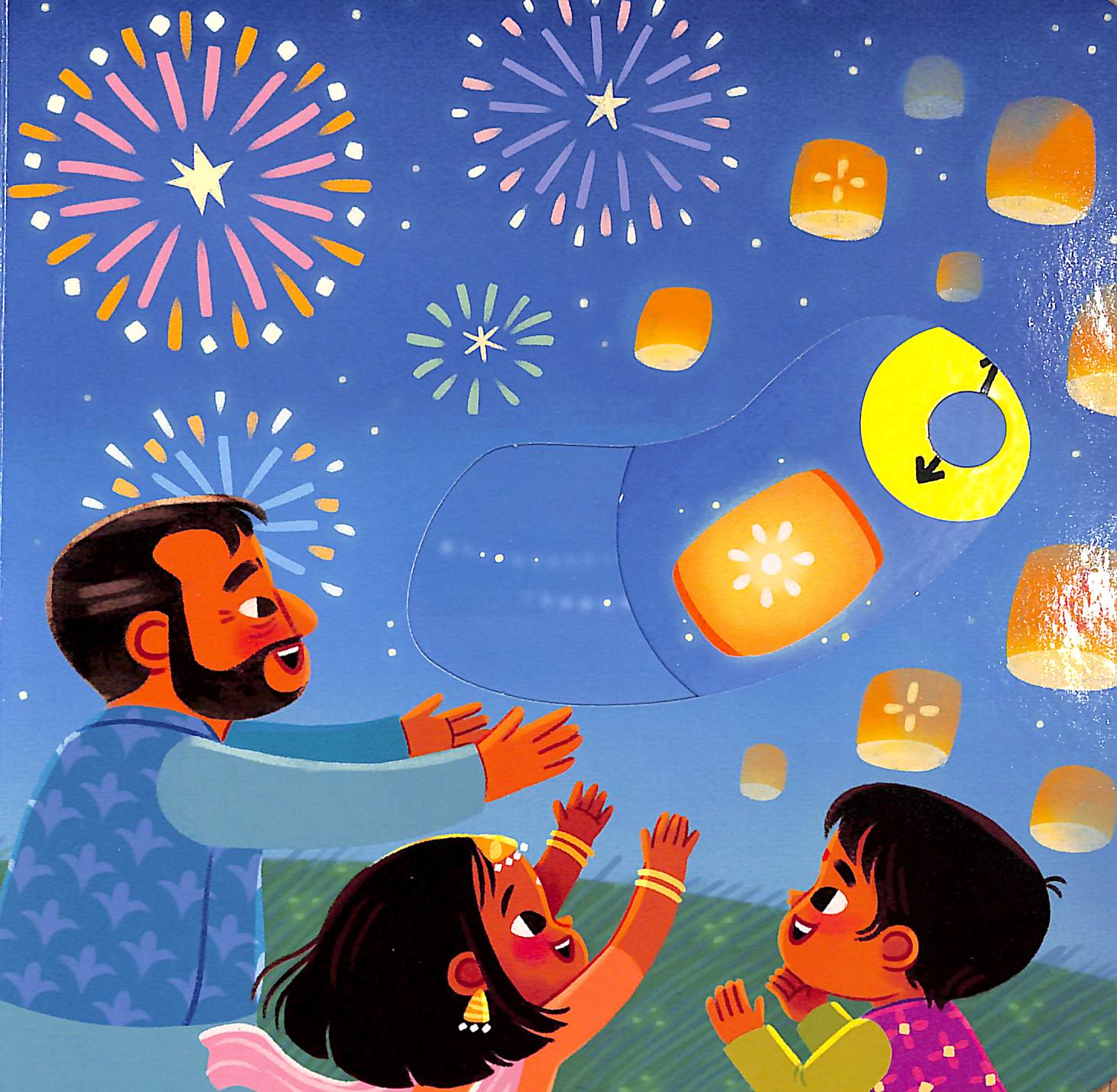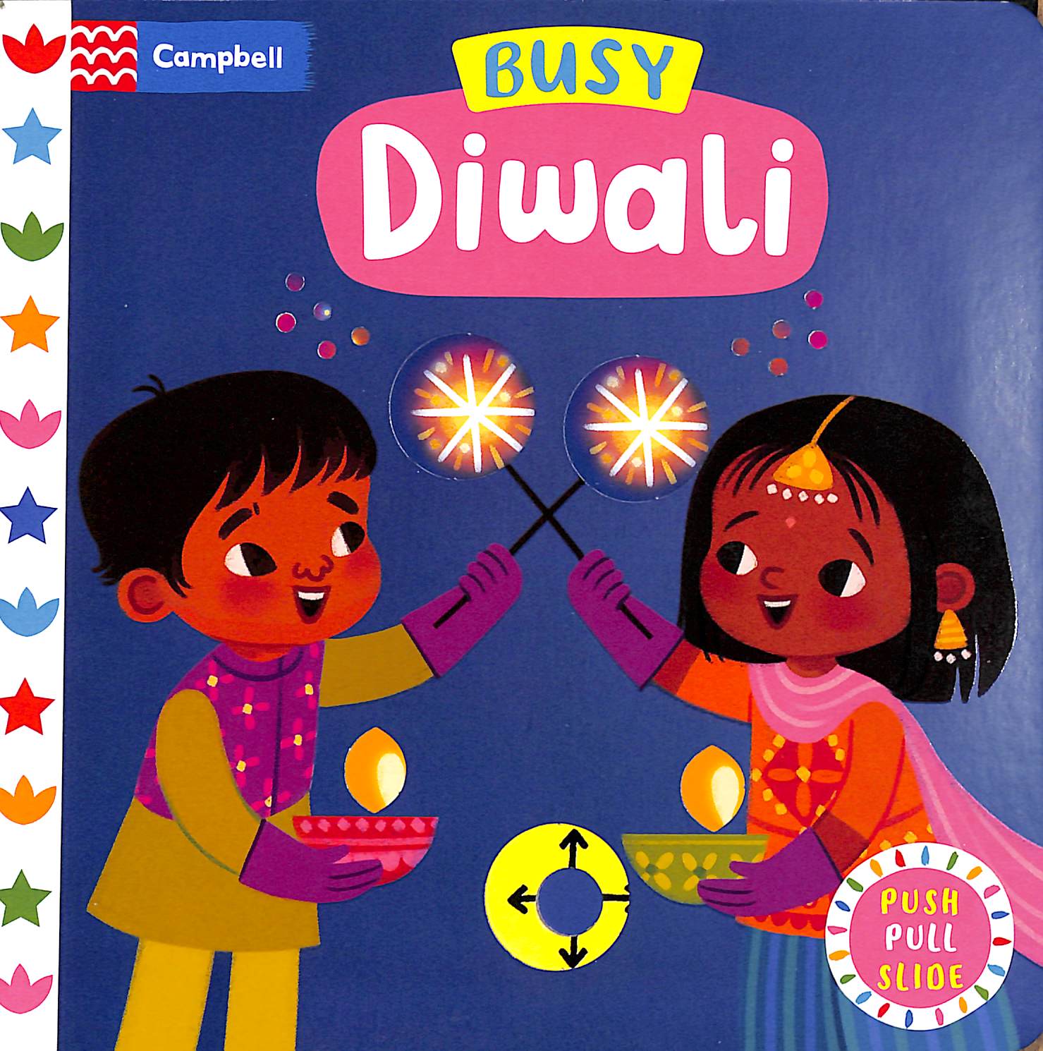 Young children can push, pull and slide the tabs to celebrate the festival of lights in Busy Diwali!