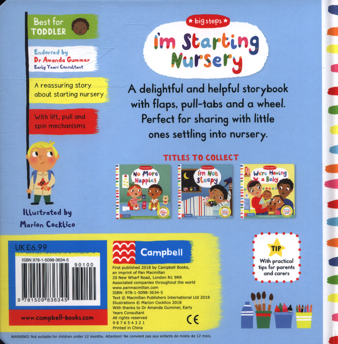 In I'm Starting Nursery, Ben is sad when Daddy drops him off for his first day . . . but not for long! He soon makes friends and in no time at all, Daddy is back. Watch Ben and his friends play with trucks, paint pictures, dress up and listen to a story in this fun-filled novelty book with flaps and mechanisms.