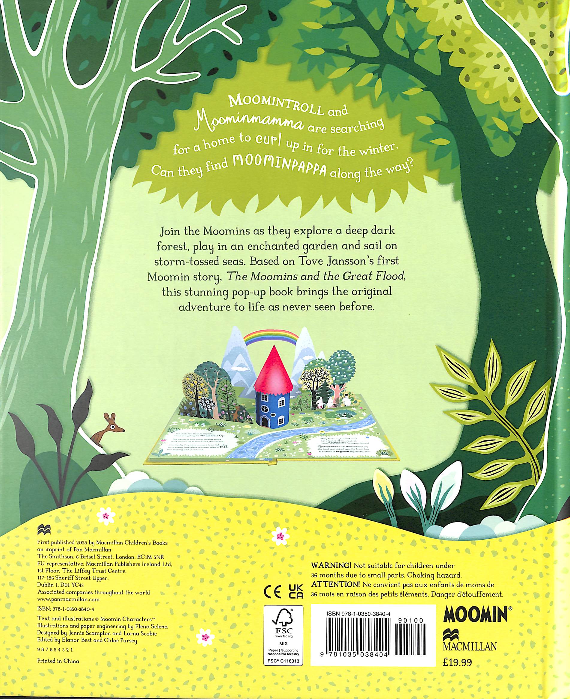 Celebrate the 80th anniversary of the Moomins with this gorgeous pop-up book based on Tove Jansson's first ever Moomin story, The Moomins and the Great Flood and bring the adventure to life in a way never seen before. It began to rain. The waters rose higher and higher until they became a great flood!