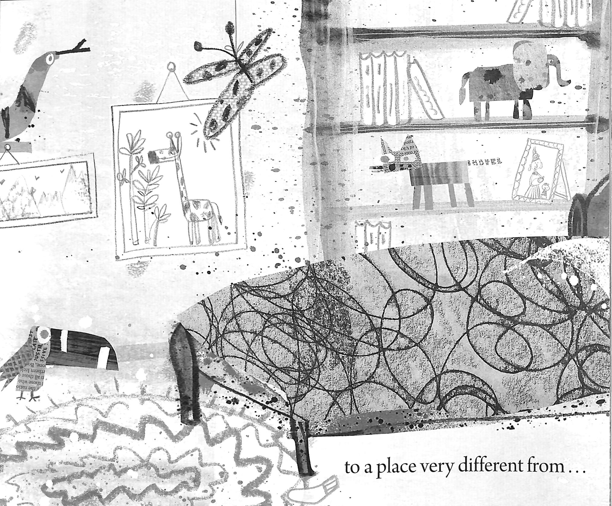 His world is rather grey. However, he spends his time imagining a wonderful world filled with exotic plants and unusual animals.