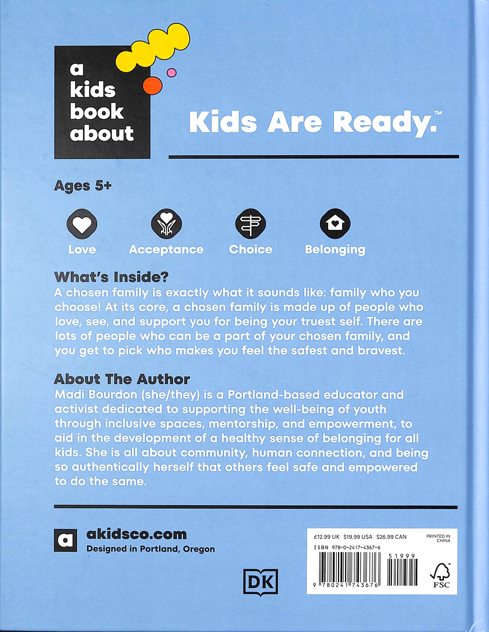 Chosen family looks unique to each of us, but they should all make us feel safe and supported!A Kids Book About Chosen Family features: A large and bold, yet minimalist font design that allows kids freedom to imagine themselves in the words on the pages. A friendly, approachable, empowering and child-appropriate tone throughout. An incredible and diverse group of authors in the series who are experts or have first-hand experience of the topic. Tackling important discourse together! The A Kids Book About titles are best used when read together.