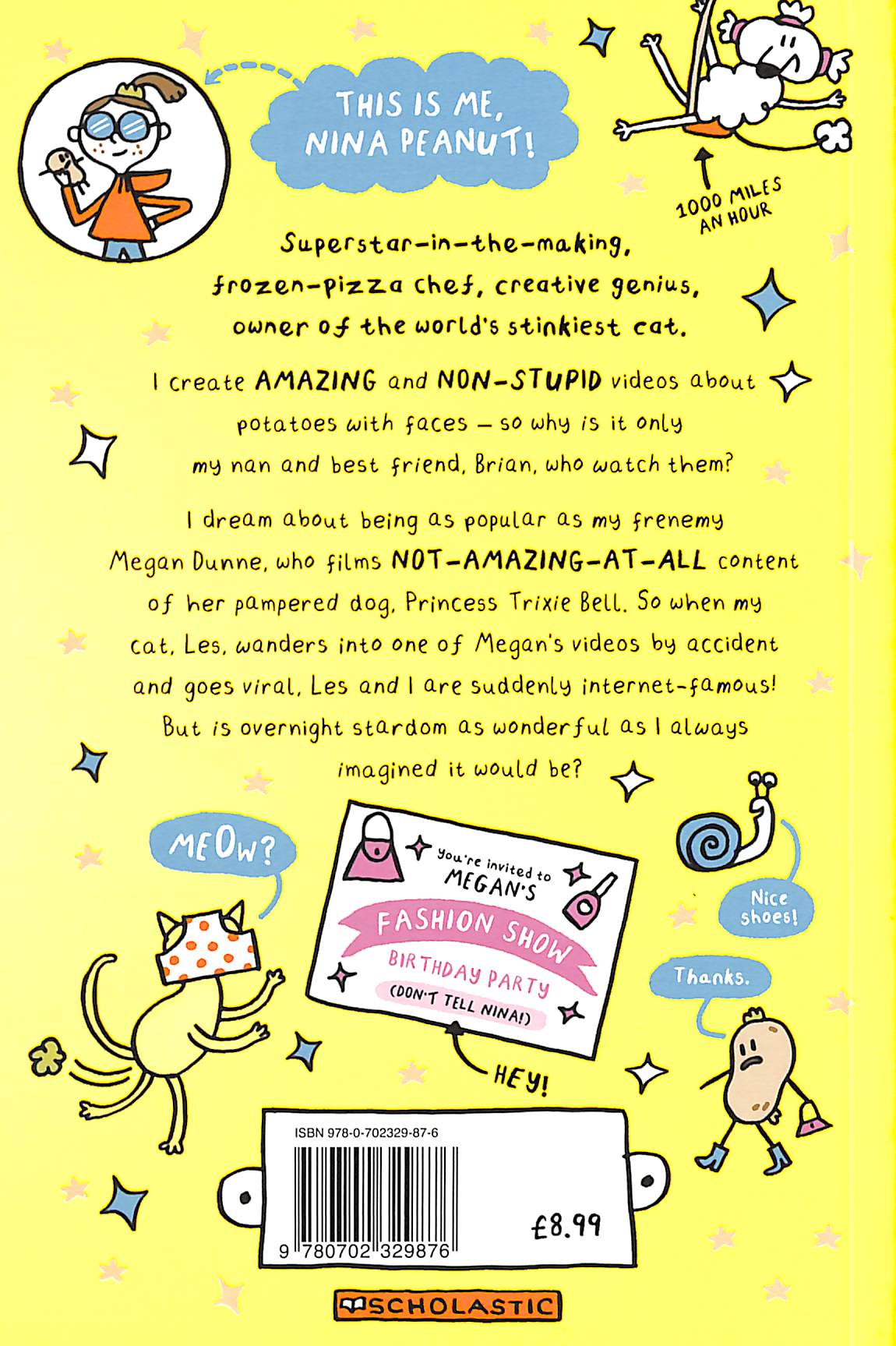 Surely everyone should be interested in her SERIOUS and NOT-STUPID videos about potatoes with faces? Nina dreams about being as popular as class queen bee Megan Dunne, who films NOT AMAZING AT ALL content of her pampered dog, Princess Trixie Bell. So when Nina's stinky cat Les wanders into one of Megan's videos by accident, and goes viral, Nina and Les are suddenly internet famous! But is overnight stardom as wonderful as Nina always imagined it would be? Hilariously funny, with themes of friendship/frenemies, big dreams, brilliant pets: hours and hours of reading fun guaranteed for kids. Warm, offbeat wit and gorgeous, bright full colour pictures throughout. Perfect for fans of Wimpy Kid, Dork Diaries and Lottie Brooks.