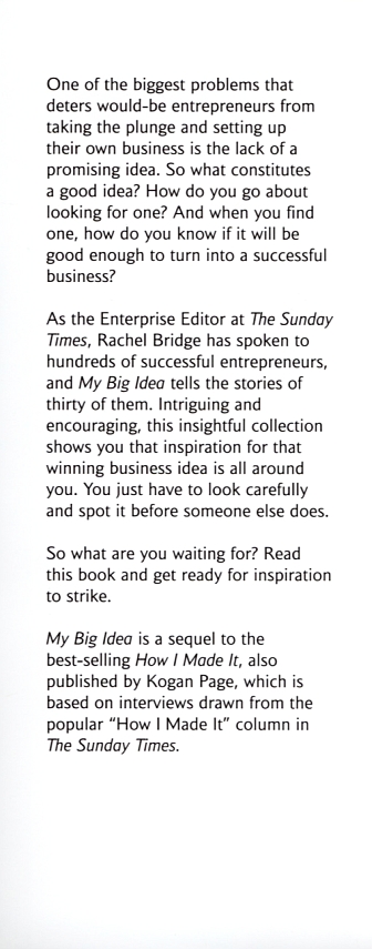 ?Have you ever wondered why you never see shops selling chocolate-covered sprouts? Or cat food that glows in the dark? Or why you can?t buy edible cutlery? Well it?s probably because they are not very good ideas. Unfortunately it is usually far easier to think up hopeless ideas than good ones. In fact one of the biggest things that deters would-be entrepreneurs from taking the plunge and setting up their own business is lack of a promising idea.? ?Introduction, My Big Idea. My Big Idea tells the stories of thirty successful entrepreneurs and how and where they found the inspiration for their business. We hear about the big ideas that, against all odds, were turned into reality but also about the ideas that seemed promising at the time but did not have staying power.