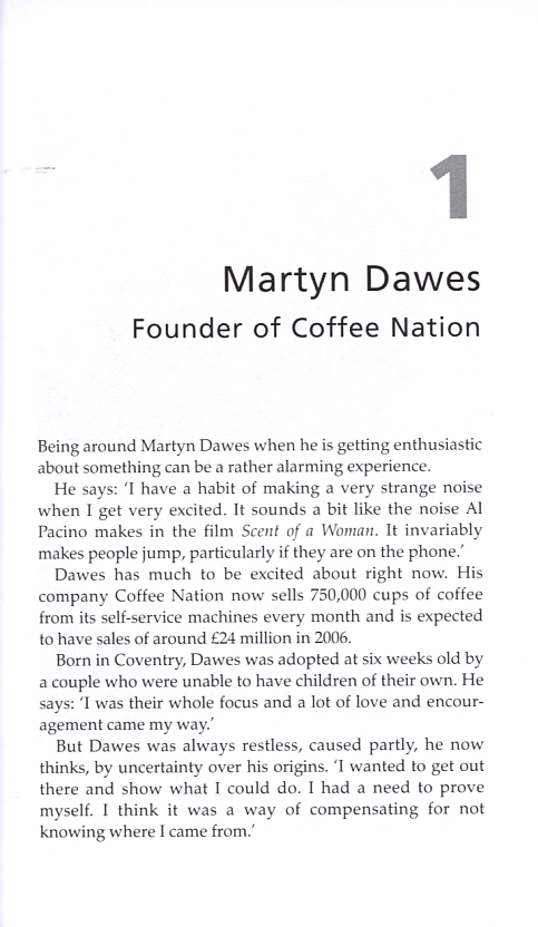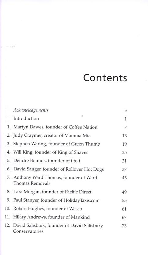 Each chapter is dedicated to a different entrepreneur and contains a fact file about them, together with their personal philosophies. Entrepreneurs featured include: Judy Craymer, creator of the musical Mamma Mia; Richard Tang, founder of Zen Internet; Don Lewin, founder of Clinton Cards and Will King, founder of King of Shaves.