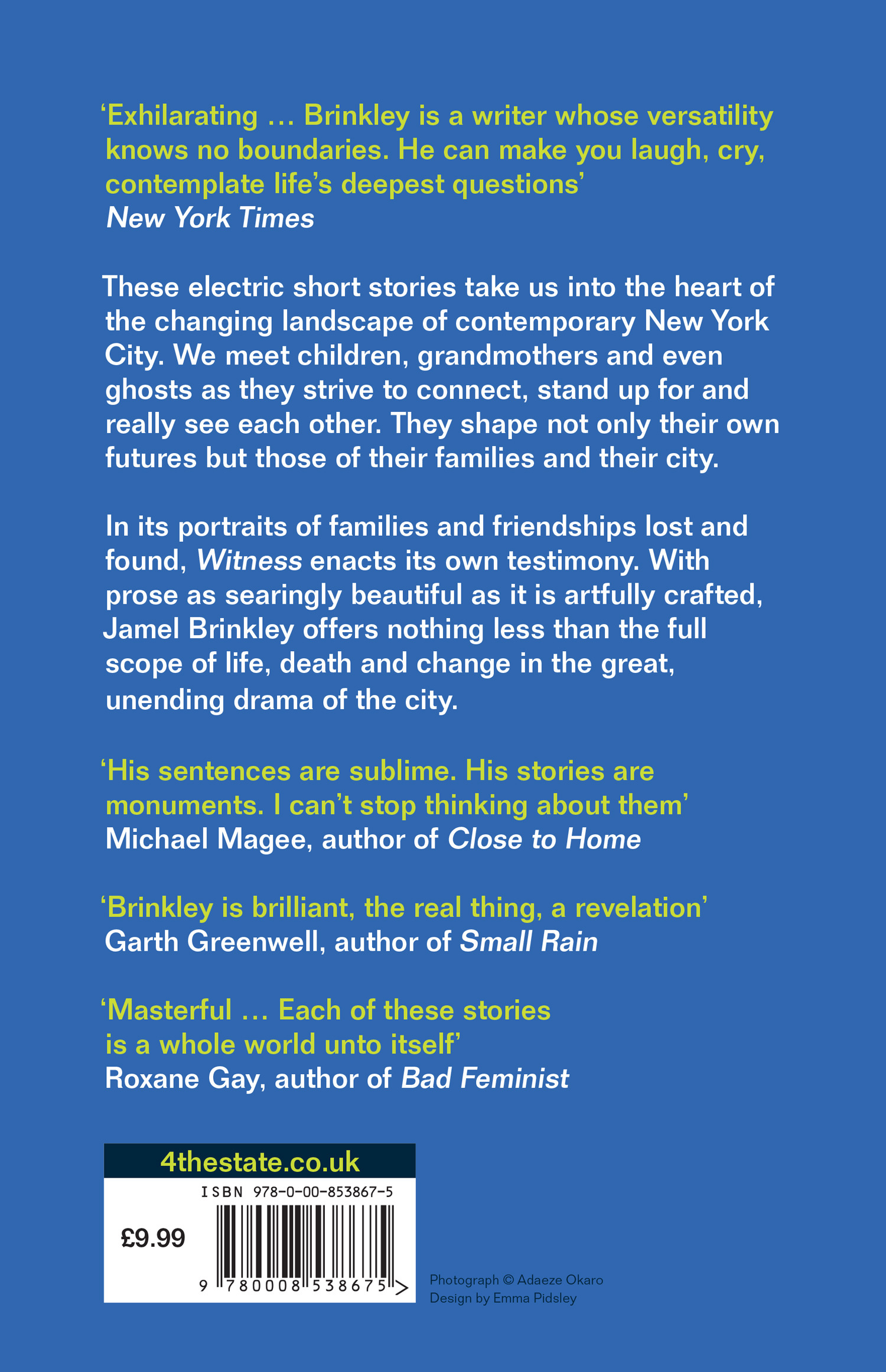 Here is a world where fortunes can be made and stolen in a generation, where strangers sometimes show kindness while those we trust—doctors, employers, siblings—too often turn away, where joy comes in snatches. With prose as upendingly beautiful as it is artfully crafted, Jamel Brinkley offers nothing less than the full scope of life and death and change in the great, unending drama of the city. ‘Exhilarating and impactful … Each story is a gift’ New York Times ‘A dazzling collection by a masterful storyteller’ Yiyun Li, author of The Book of Goose ‘Read everything this man writes, and regard the world anew’ Justin Torres, author of We the Animals ‘Jamel Brinkley is brilliant, the real thing, a revelation’ Garth Greenwell, author of What Belongs to You ‘These are stories of rare beauty and insight, that glitter with humour and hurt, written with lambent clarity and tenderness’ David Hayden, author of Darker With the Lights On ‘There is all the involvedness and complexity of a novel in each story, which makes Witness so abundant and wise.