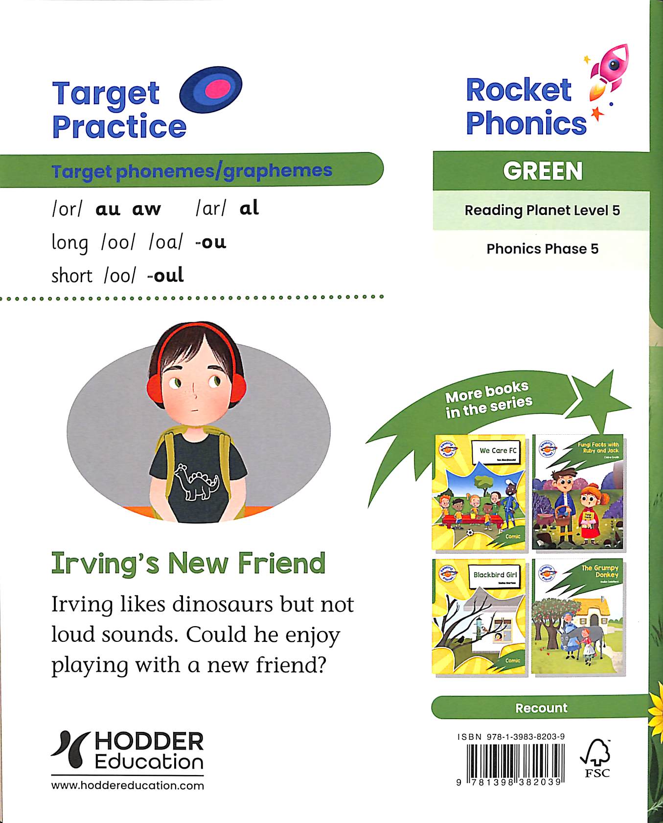 Soon the two children bond over Iriving's dinosaurs and both are happy to have found a new friend. (Letter-sounds featured: /or/ au aw /ar/ al long /oo/ /oa/ -ou short /oo/ -oul ) Irving's New Friend is part of the Rocket Phonics systematic synthetic phonics programme from Reading Planet.