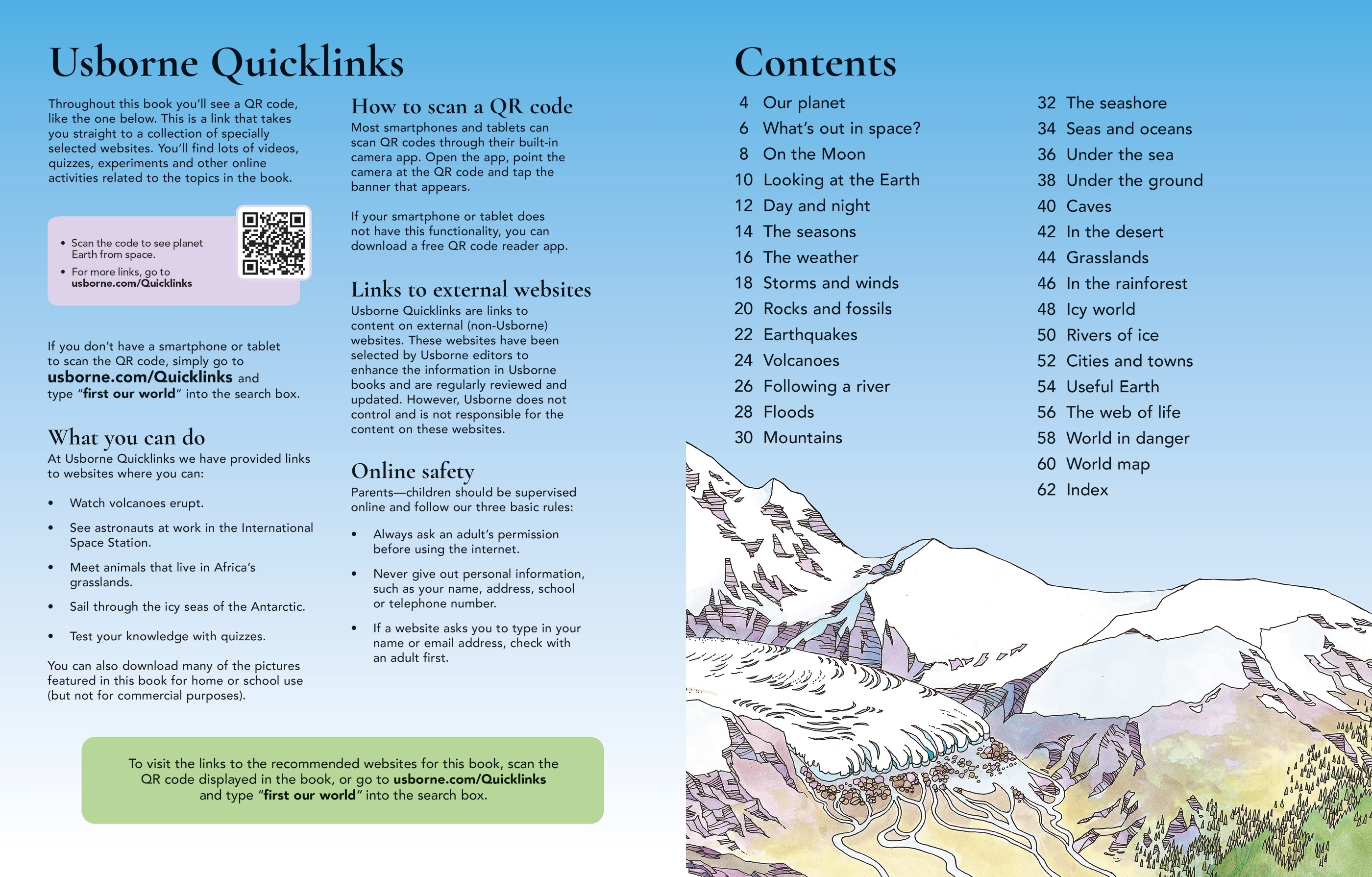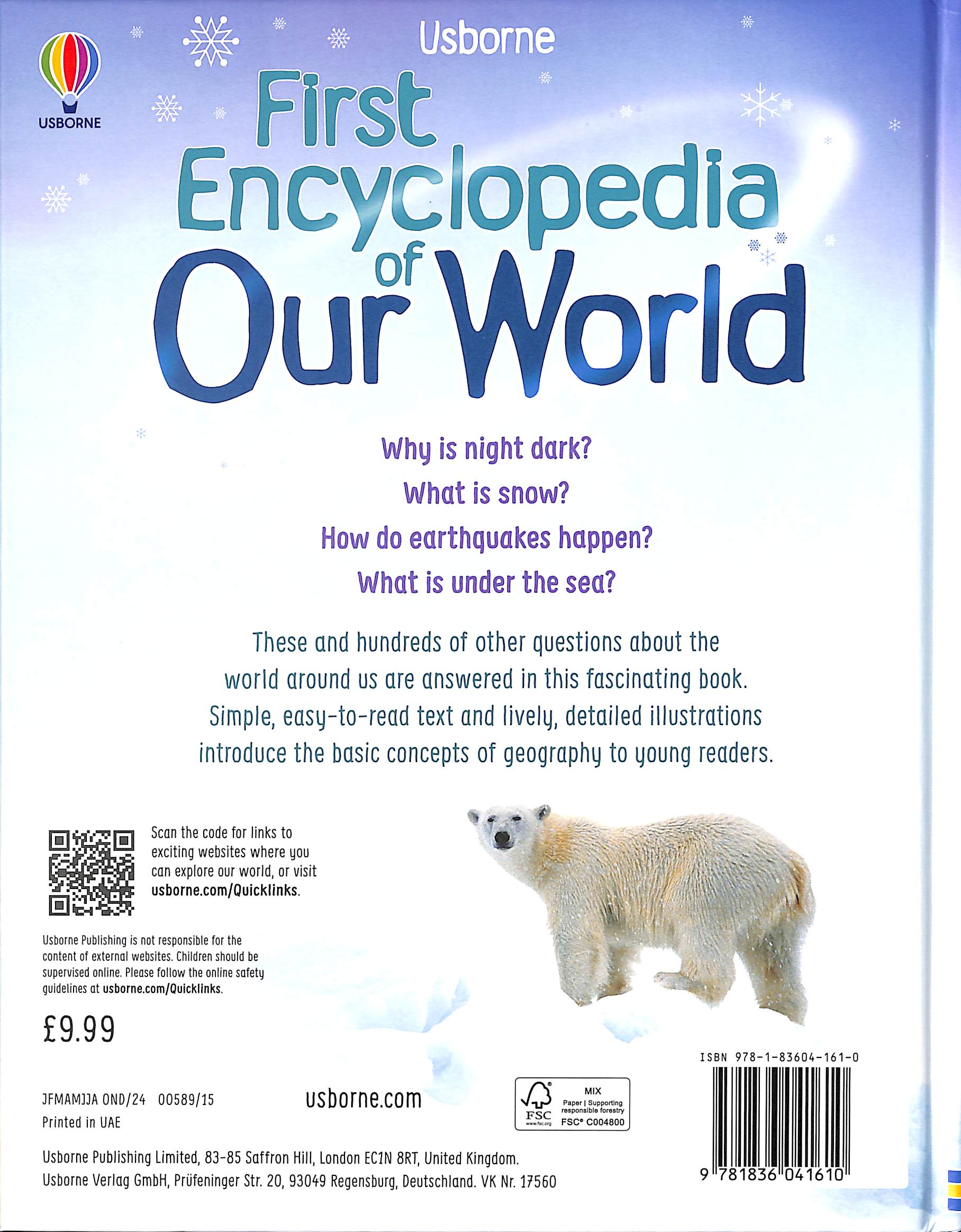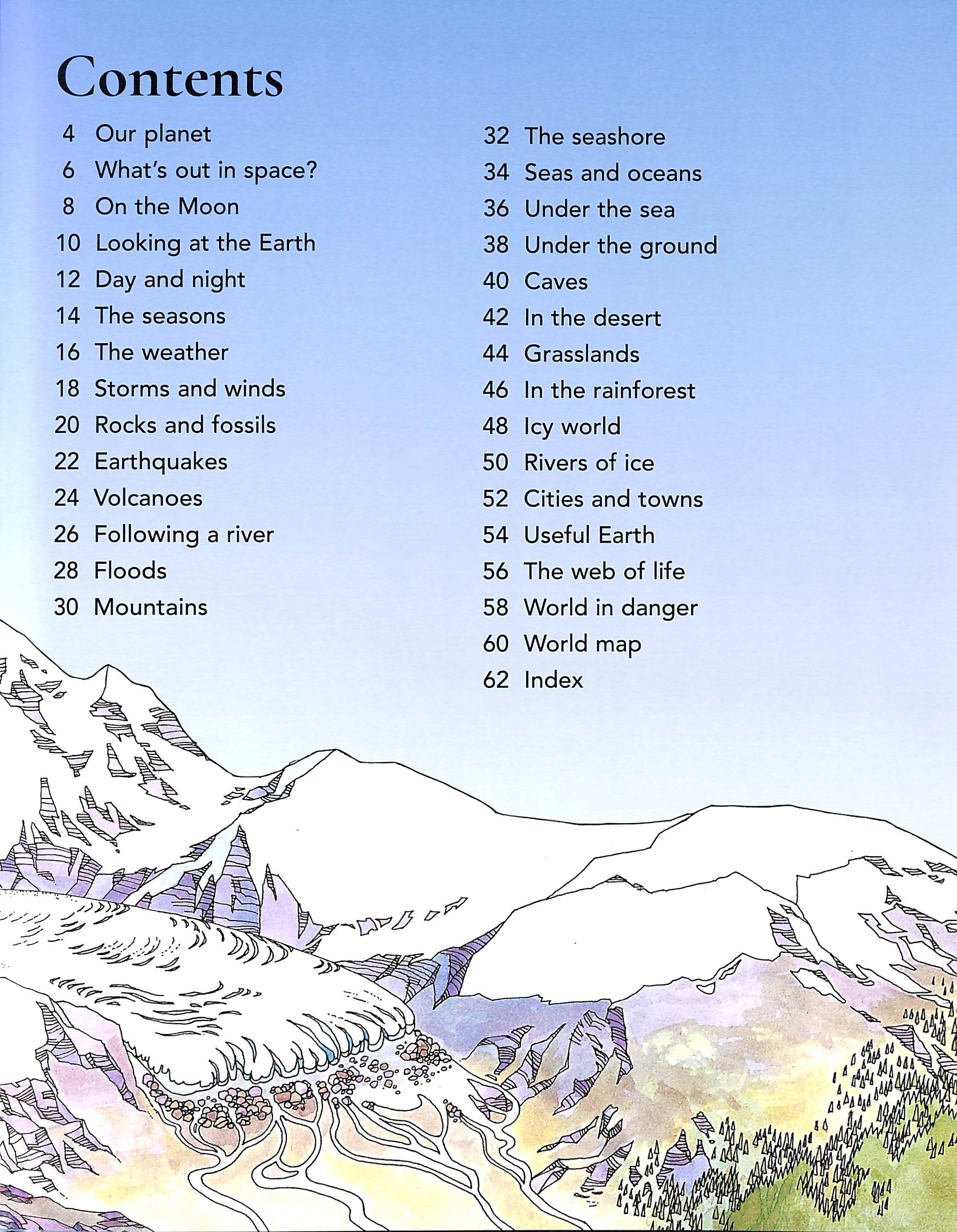 Provides simple explanations which answer questions such as "Why is night dark?" "How do earthquakes happen?" and "What is under the sea?" Includes QR codes for links to carefully selected fun websites. Chapters in this book include:- Our planet- What's out in space?- On the Moon- Looking at the Earth- Day and night- The seasons- The weather- Storms and winds- Rocks and fossils- Earthquakes- Volcanoes- Following a river- Floods- Mountains- The seashore- Seas and oceans- Under the sea- Under the ground- Caves- In the desert- Grasslands- In the rainforest- Icy world- Rivers of ice- Cities and towns- Useful earth- The web of life- World in danger- World map