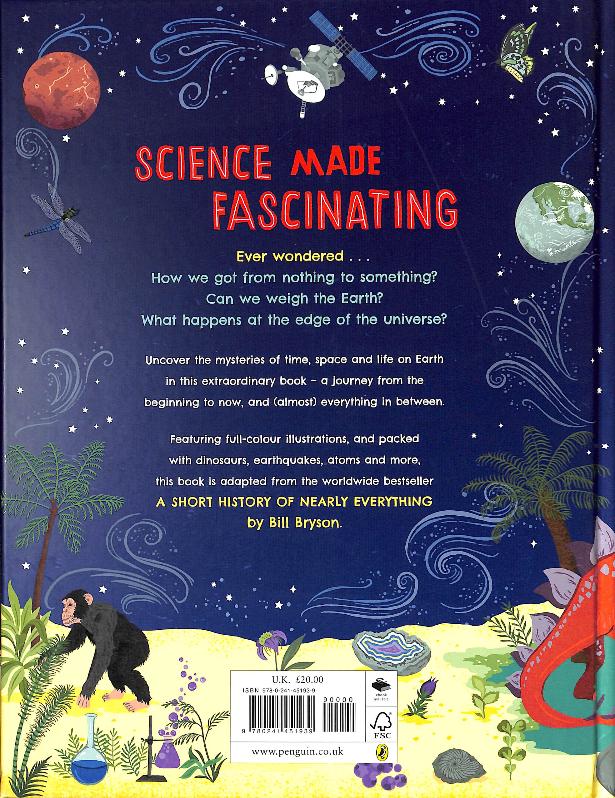 Ever wondered how we got from nothing to something?Or thought about how we can weigh the earth?Or wanted to reach the edge of the universe?Uncover the mysteries of time, space and life on earth in this extraordinary book - a journey from the centre of the planet, to the dawn of the dinosaurs, and everything in between. And discover our own incredible journey, from single cell to civilisation, including the brilliant (and sometimes very bizarre) scientists who helped us find out the how and why. The ideal book for curious young readers everywhere. ************************************************************************Reviews for A Short History of Nearly Everything:'It's the sort of book I would have devoured as a teenager.