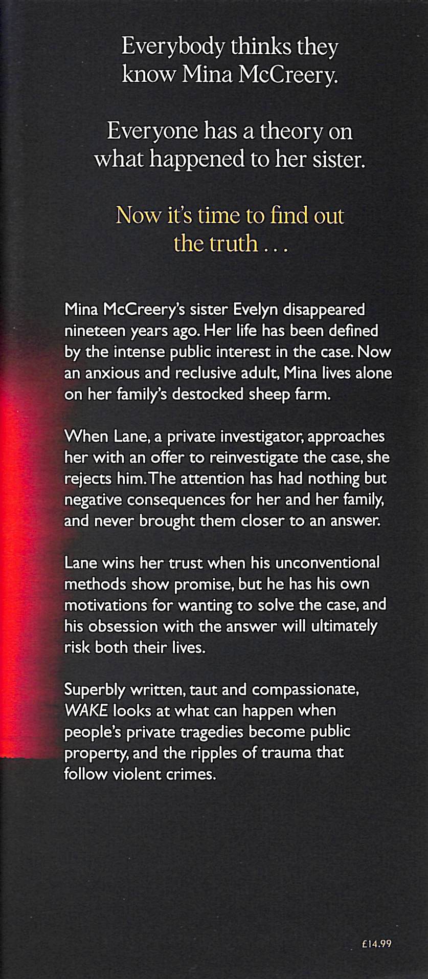 The attention has had nothing but negative consequences for her and her family, and never brought them closer to an answer. Lane wins her trust when his unconventional methods show promise, but he has his own motivations for wanting to solve the case, and his obsession with the answer will ultimately risk both their lives. Superbly written, taut and compassionate, Wake looks at what can happen when people's private tragedies become public property, and the ripples of trauma that follow violent crimes.