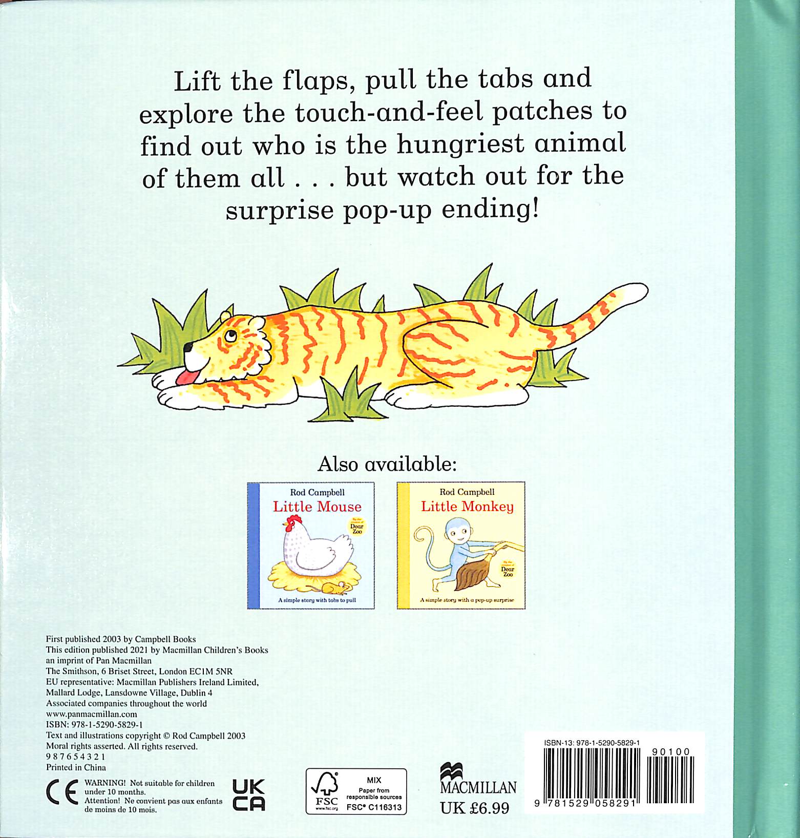This fun animal story from the creator of Dear Zoo is sure to delight young children, with touch-and-feel patches, flaps to lift and a surprise pop-up ending. The hungry mouse likes eating cheese, the rabbit likes carrots and the monkey likes bananas – but what about the hungry tiger?