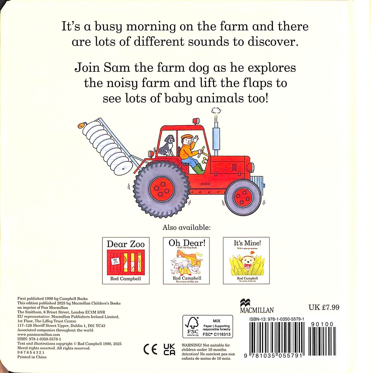 Meet Sam the farm dog, visit the animals and don't forget to join in by calling out their noises!This special 35th anniversary gift edition of the much-loved preschool classic features a gold foil cover – the perfect gift for every toddler. With bright, bold artwork, a simple, engaging text and a whole host of favourite farm animals, Noisy Farm is a perfect first farm animal story book – and the chunky board book format and sturdy card flaps make it great for small hands. Rod Campbell, the creator of the preschool lift-the-flap classic Dear Zoo, has been a trusted name in early learning for over forty years.
