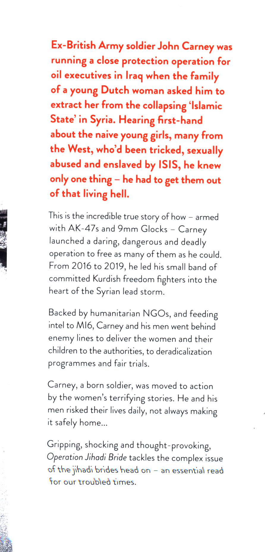 Soldier Magazine's Book of the MonthFascinating... Incredibly dangerous. The TimesGripping. Adrenalin fuelled true-life account with all the makings of a military thriller. The action unfolds like a Le Carre novel. Soldier Magazine'Jihad isn't a war. It's an objective. An aberration. If there are young women with children, lost boys... If they are trapped in that hell and we can get them out, don't we have a duty to do so? Every person we can bring back is living proof that Islamic State is a failure.'Ex-British Army soldier John Carney was running a close protection operation for oil executives in Iraq when the family of a young Dutch woman asked him to extract her from the collapsing 'Islamic State' in Syria. Hearing first-hand about the naive young girls, many from the West, who'd been tricked, sexually abused and enslaved by ISIS, he knew only one thing - he had to get them out of that living hell. This is the incredible true story of how - armed with AK-47s and 9mm Glocks - Carney launched a daring, dangerous and deadly operation to free as many of them as he could. From 2016 to 2019, he led his small band of committed Kurdish freedom fighters into the heart of the Syrian lead storm. Backed by humanitarian NGOs, and feeding intel to MI6, Carney and his men went behind enemy lines to deliver the women and their children to the authorities, to deradicalization programmes and fair trials. Carney, a born soldier, was moved to action by the women's terrifying stories. He and his men risked their lives daily, not always making it safely home... Gripping, shocking and thought-provoking, Operation Jihadi Bride tackles the complex issue of the jihadi brides head on - an essential read for our troubled times.