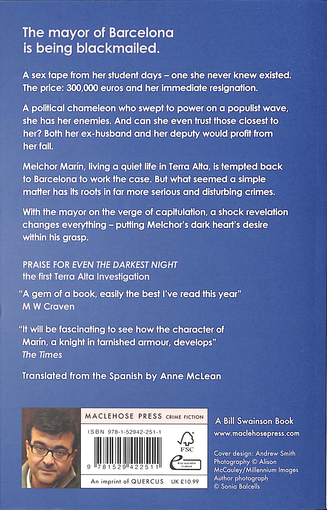 Nor can she trust those closest to her. Both her ex-husband and her deputy would profit from her fall. Melchor Marín, living a quiet life in Terra Alta, is tempted back to Barcelona to work the case.