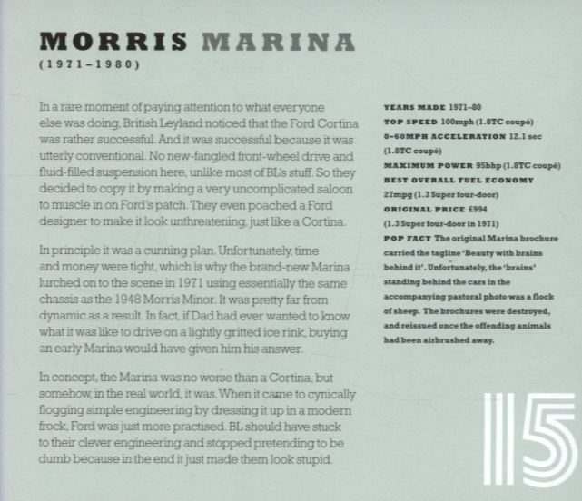 From much loved family workhorses like the Ford Cortina and Vauxhall Viva to the rakish excitement and playground kudos of the Rover 3500 and Citroen CX, all the great Dad cars are here. Reflecting a time before people carriers and lifestyle off roaders, when the nearest thing to an airbag was hiding behind your fat brother, this is a celebration of simple, honest cars that were as flawed and as loveable as your Dad himself.